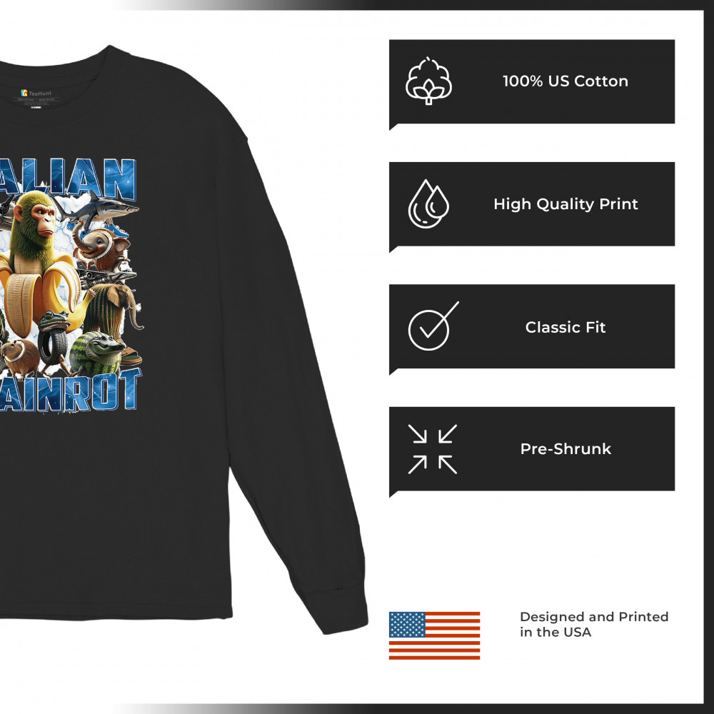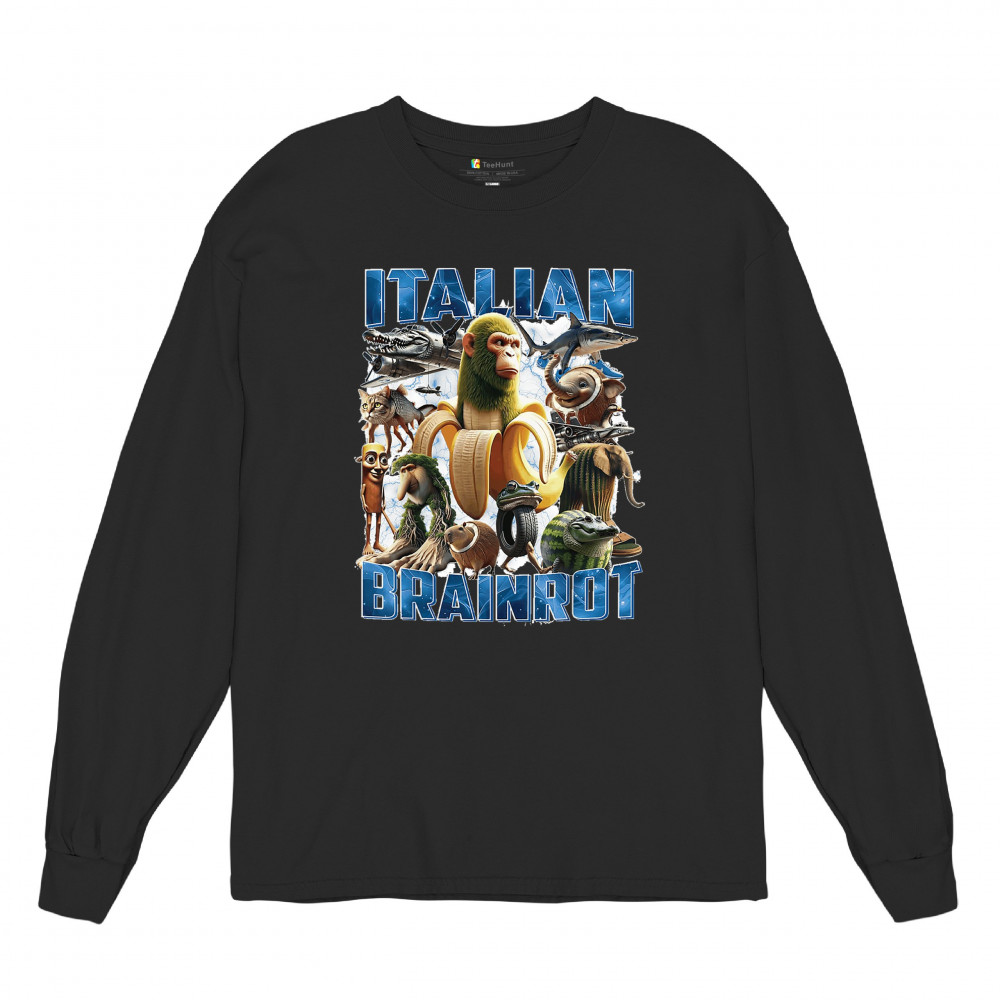 This design captures the full force of Italian brainrot—bananas, sharks, monkeys, and meme beasts collide in an unfiltered internet-core explosion. Perfect for fans of cursed humor, Gen Z trends, absurd fashion, TikTok memes, ironic style, surreal pop art, chaotic culture, digital nonsense, Gen Alpha brainrot, and hyper-online energy.
