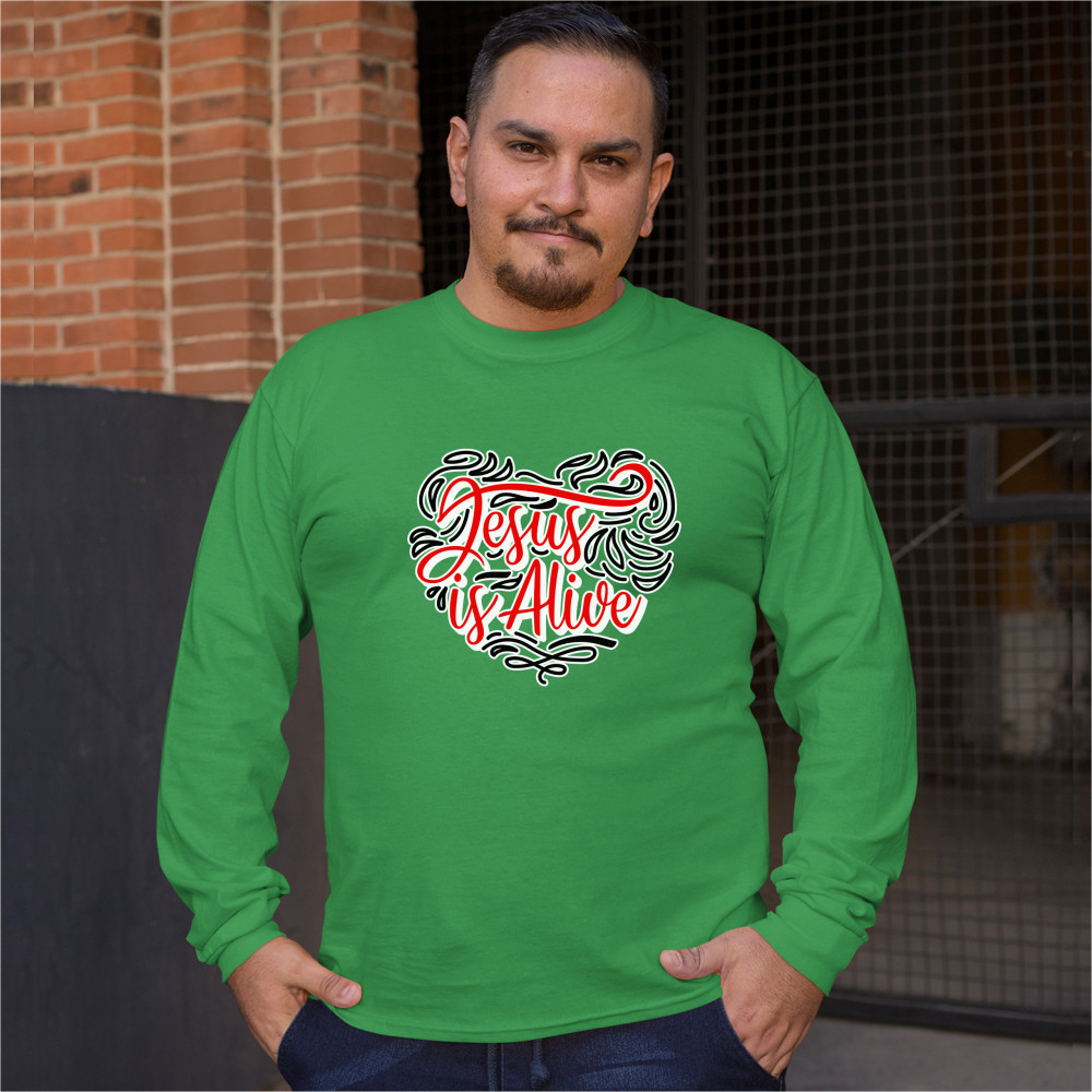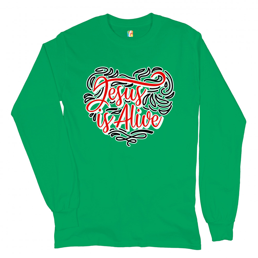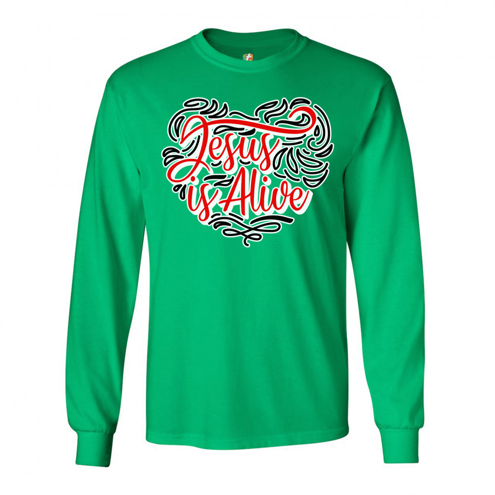JESUS IS ALIVE long sleeve t-shirt happy easter bible jesus christ has risen green