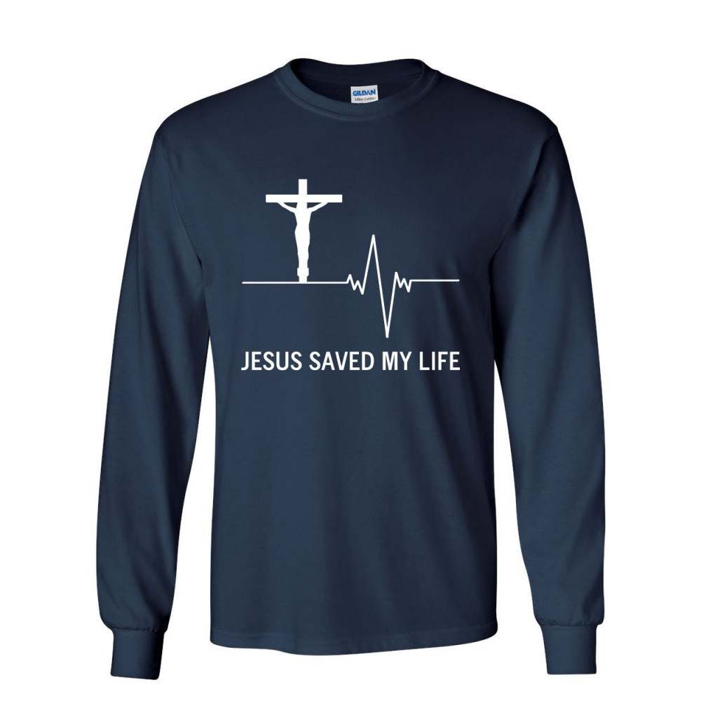 JESUS SAVED MY LIFE long sleeve t-shirt christian religion faith god navy blue
