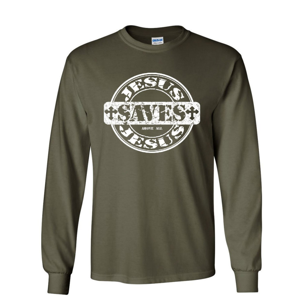 JESUS SAVES JESUS ABOVE ALL jesus saves long sleeve t-shirt jesus christ above all christianity bible tee military green