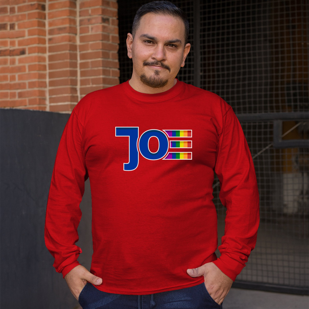 A political print featuring the name of the democratic presidential candidate "Joe". The letter "e" is painted with the colors of the lgbt rainbow. It is a great choice to wear to show your support for the democratic presidential nominee and his vice pres