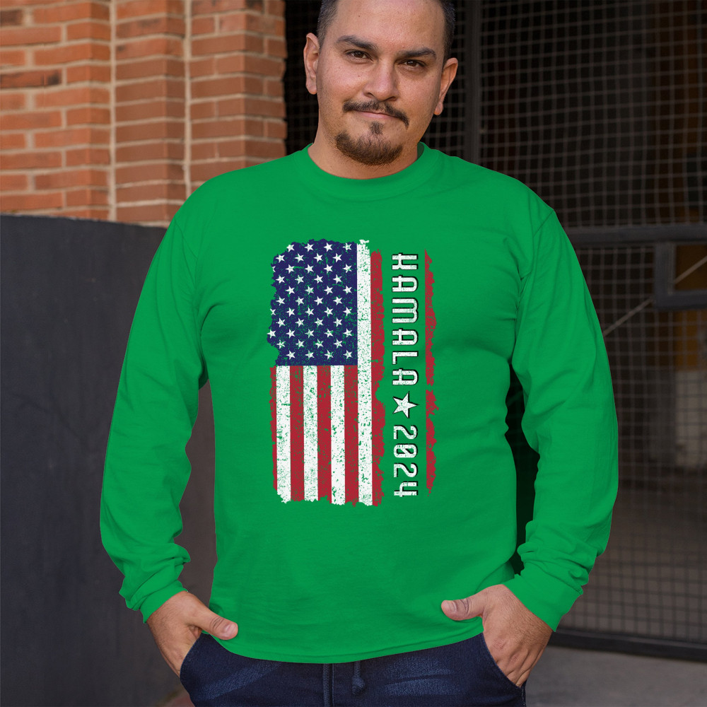 Support Kamala Harris 2024 with a bold design featuring a distressed American flag. Perfect for rallies and political events. Celebrate diversity!