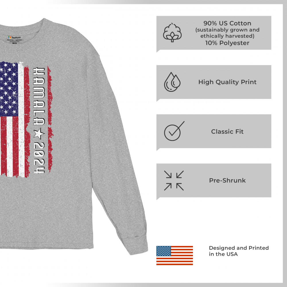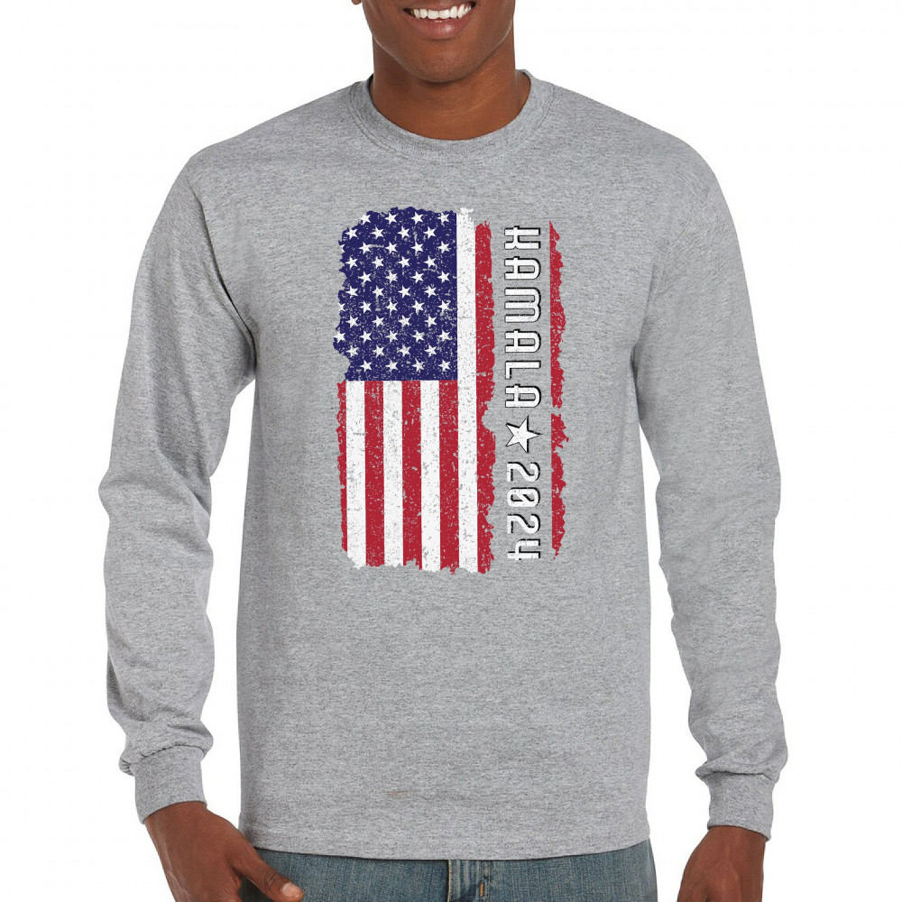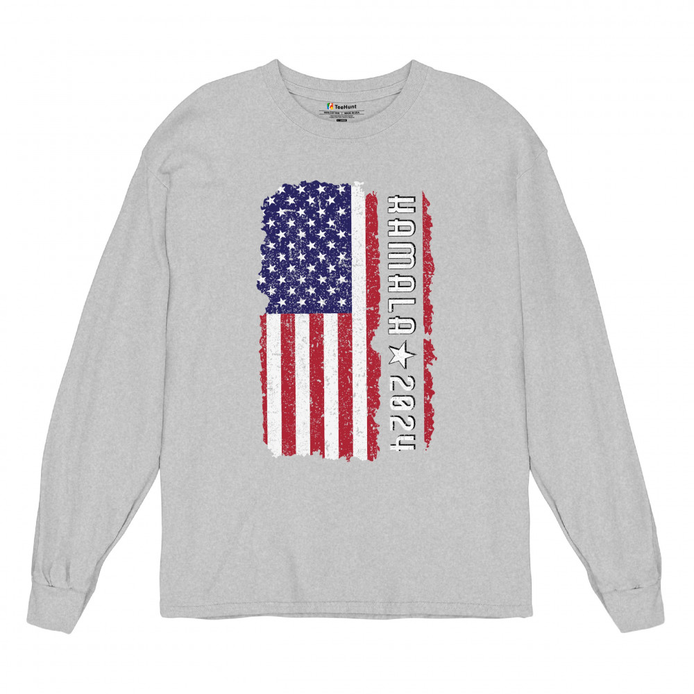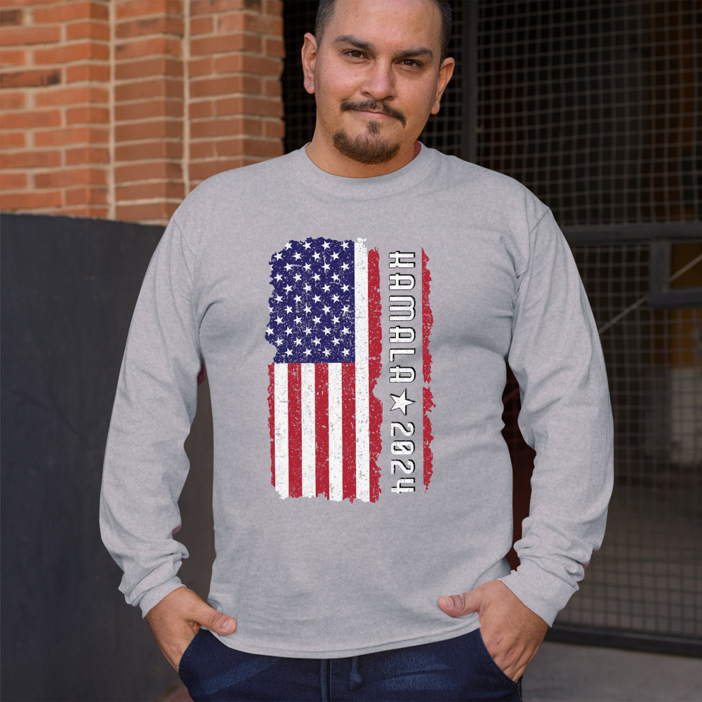 Support Kamala Harris 2024 with a bold design featuring a distressed American flag. Perfect for rallies and political events. Celebrate diversity!