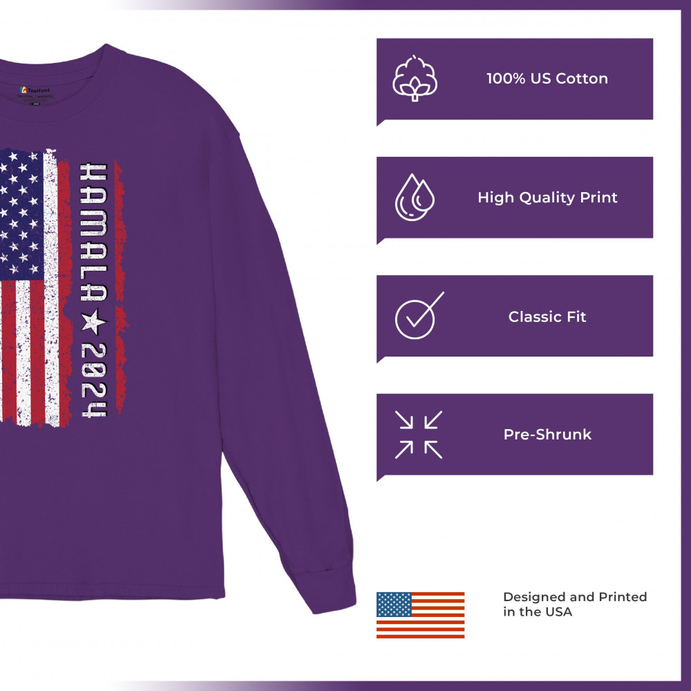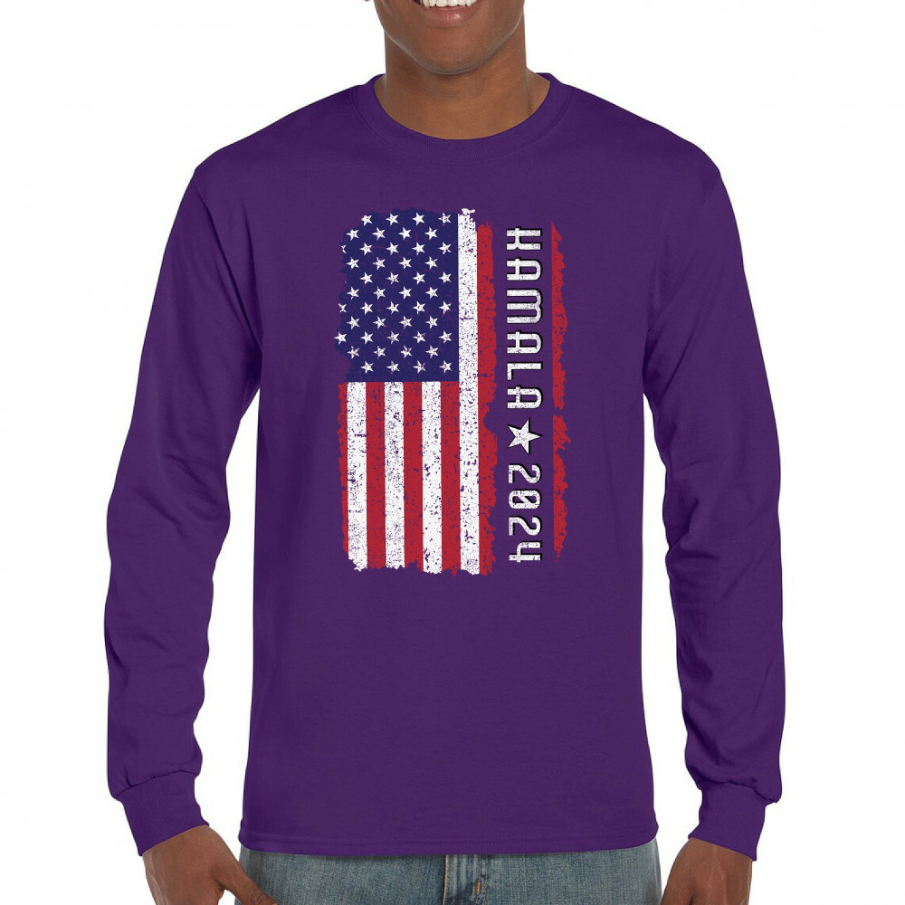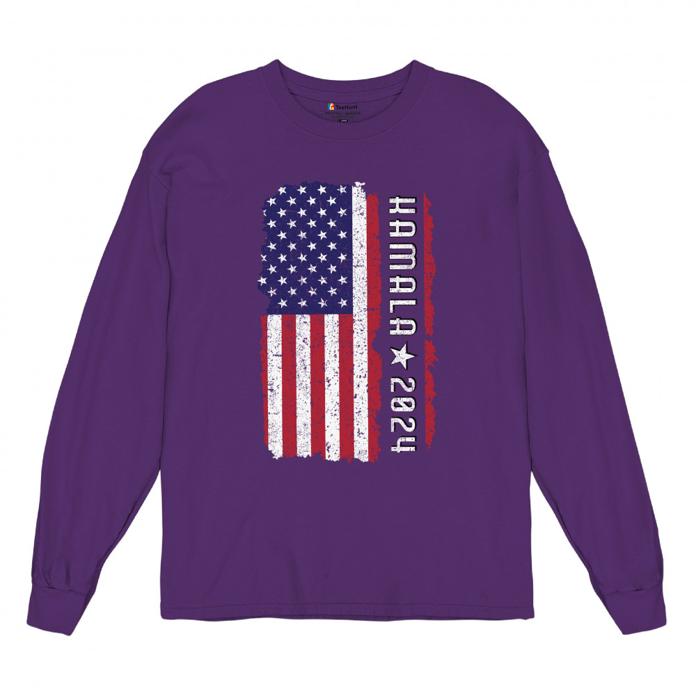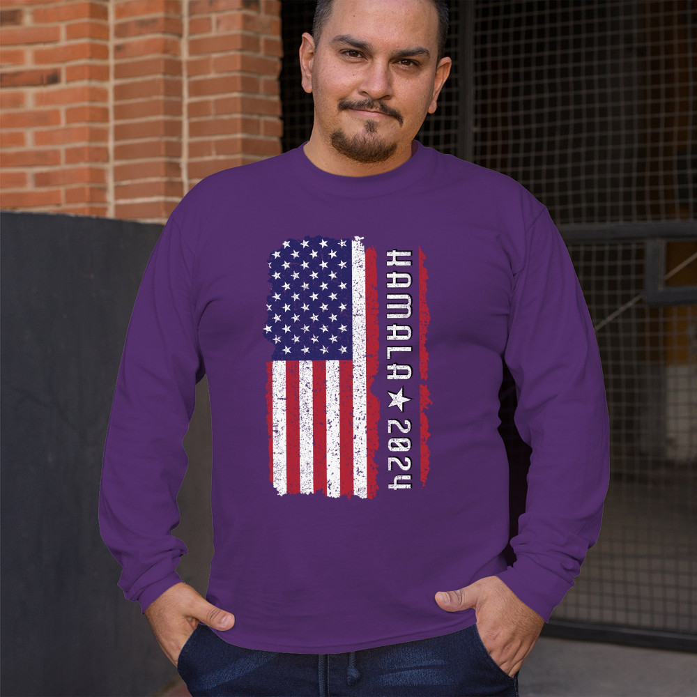 Support Kamala Harris 2024 with a bold design featuring a distressed American flag. Perfect for rallies and political events. Celebrate diversity!