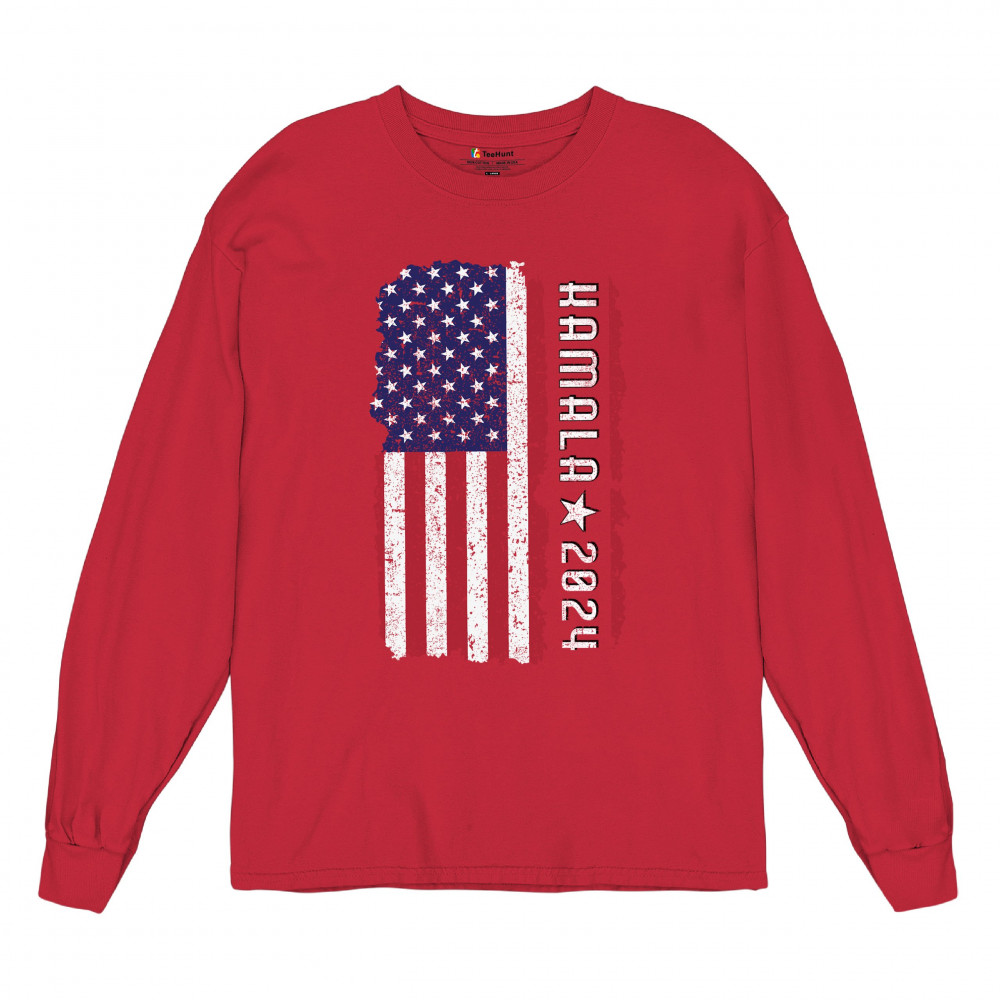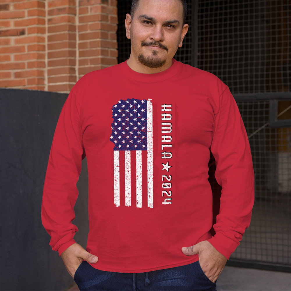 Support Kamala Harris 2024 with a bold design featuring a distressed American flag. Perfect for rallies and political events. Celebrate diversity!