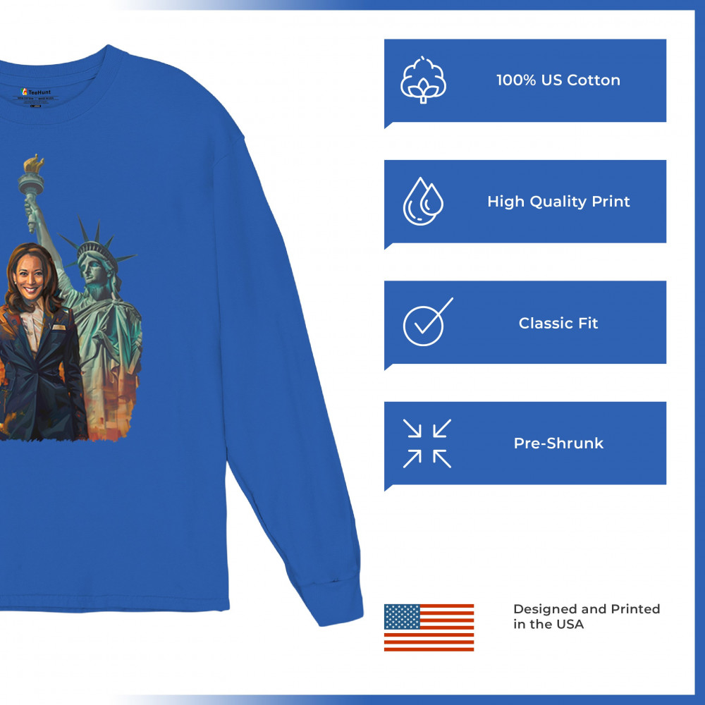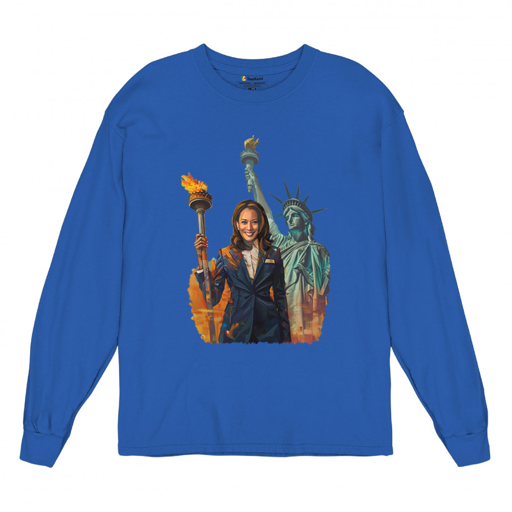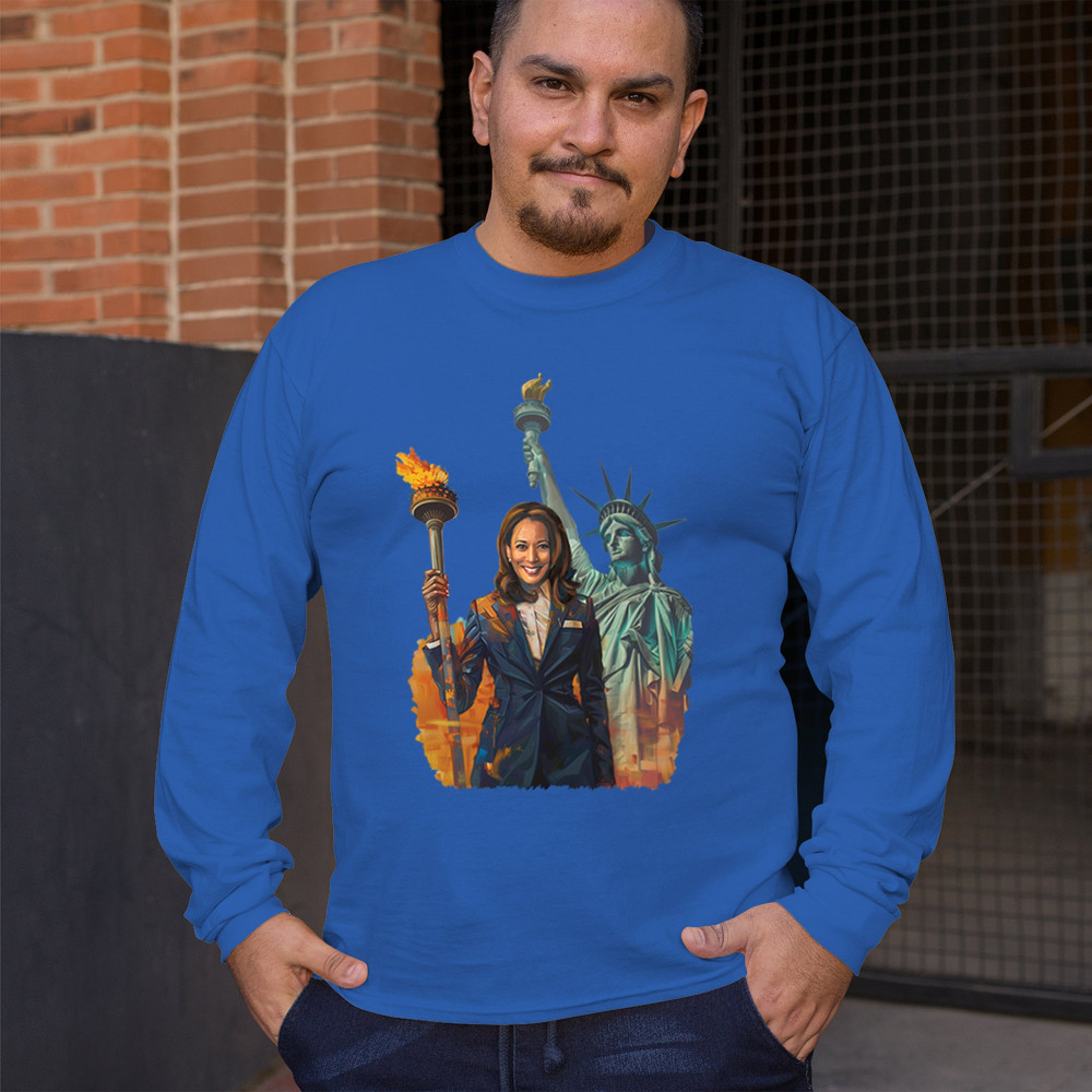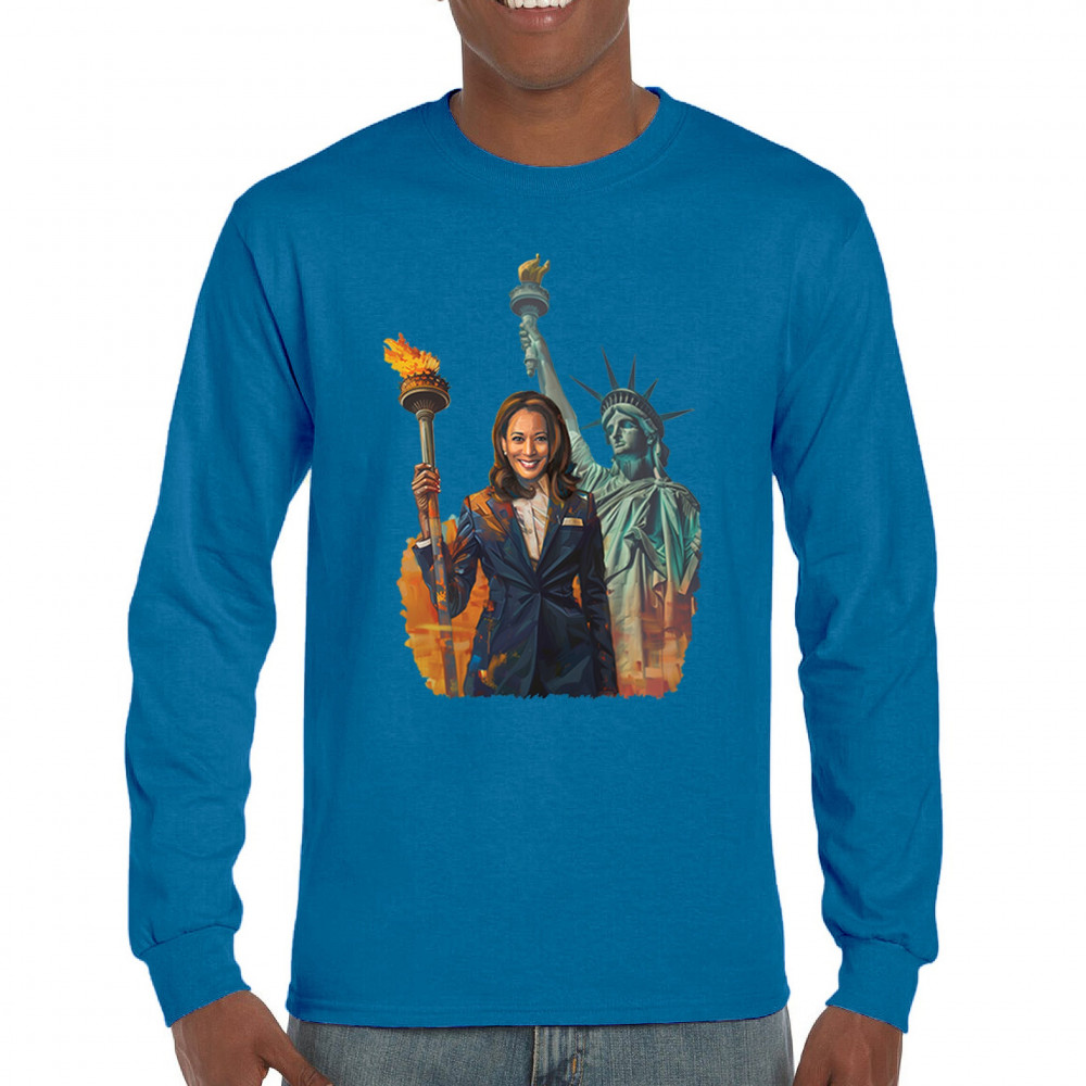 Show your support for Harris-Walz 2024 with this bold design featuring Kamala Harris and the Statue of Liberty. Stand for justice, equality, and a brighter future.