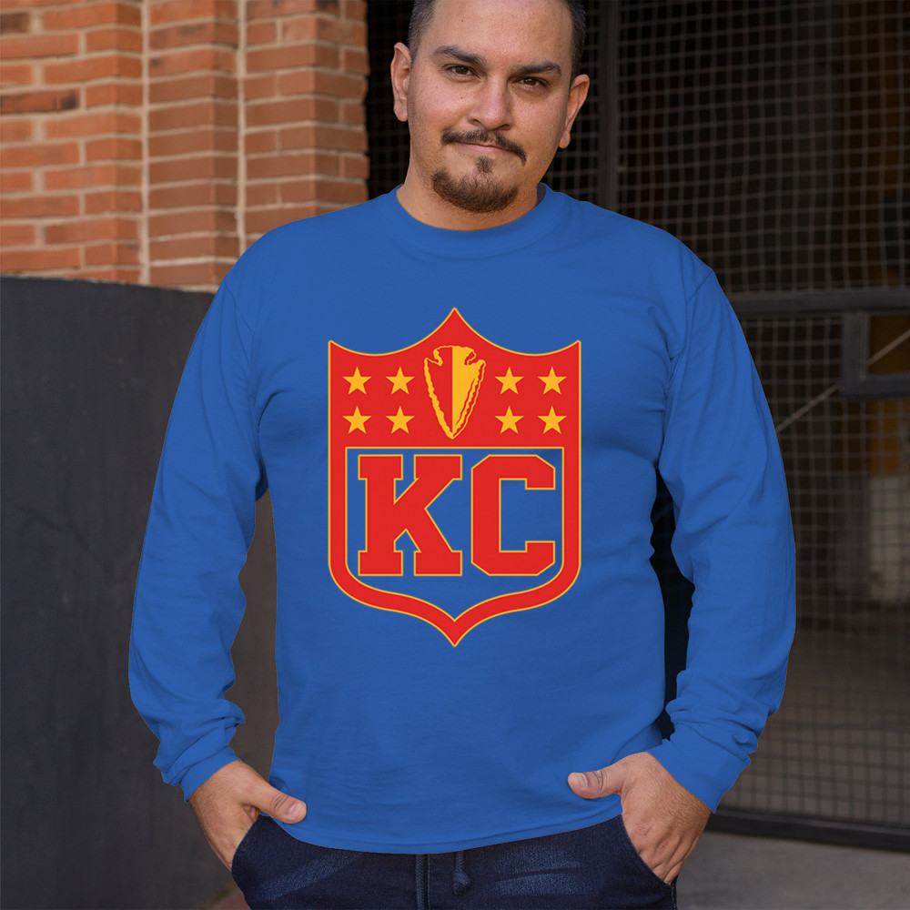 Kansas KC shield design celebrating red and gold pride, heart of America football, playoff vibes, river city culture, and big game energy.