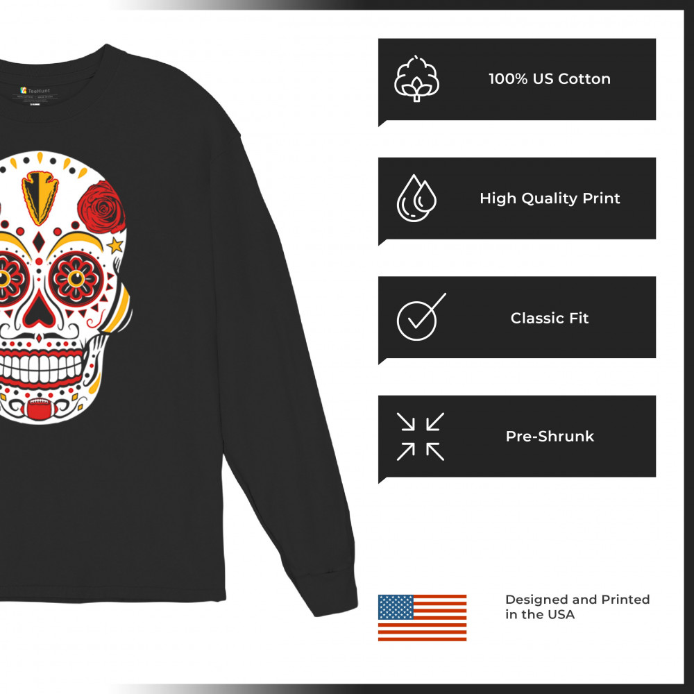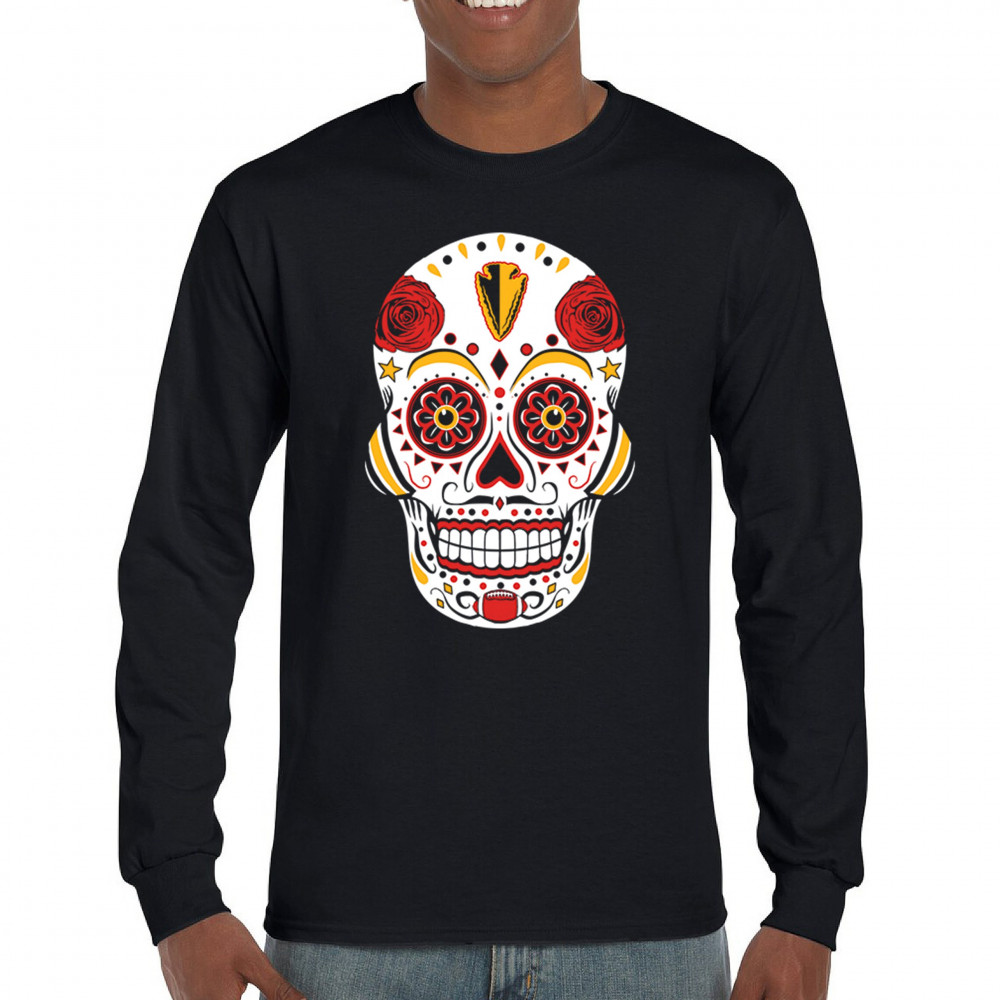 Celebrate Kansas City football with this Sugar Skull design inspired by Dia de los Muertos. Featuring Heart of America pride, red & gold tradition, and City of Fountains identity, it’s made for playoff energy, tailgate culture, and fantasy league rivalries. A bold calavera for KC fans.