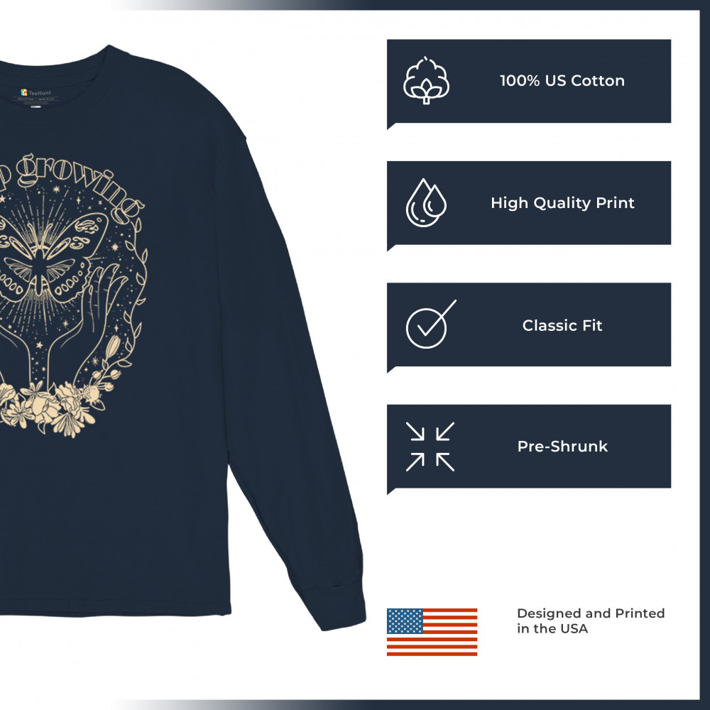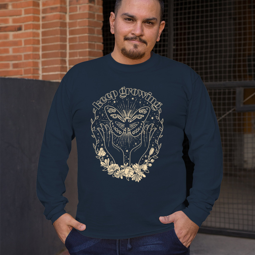 Step into your transformation with this Keep Growing design, featuring a celestial butterfly held between graceful hands and blooming flowers. A visual symbol of healing, renewal, and inner strength—perfect for journaling, meditation, yoga, or nature-inspired living. Ideal for dreamers, wellness seekers, and spiritual adventurers.