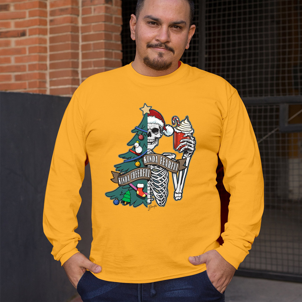 This creative Kinda Cheerful, Kinda Fearful design is a perfect blend of festive and spooky fun! Featuring a half-decorated Christmas tree and skeleton, it’s ideal for those who love combining Halloween and Christmas vibes. Great for secret Santa gifts, matching holiday pajamas, or rocking at your next ugly sweater contest. Perfect for office parties, family mornings, or simply adding some unique charm to your Feliz Navidad celebrations.