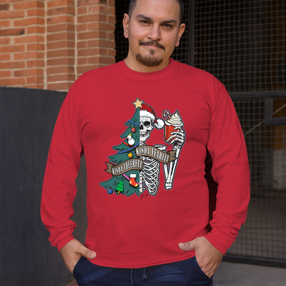This creative Kinda Cheerful, Kinda Fearful design is a perfect blend of festive and spooky fun! Featuring a half-decorated Christmas tree and skeleton, it’s ideal for those who love combining Halloween and Christmas vibes. Great for secret Santa gifts, matching holiday pajamas, or rocking at your next ugly sweater contest. Perfect for office parties, family mornings, or simply adding some unique charm to your Feliz Navidad celebrations.