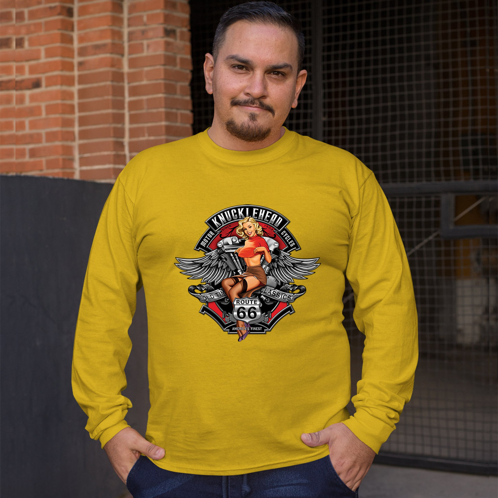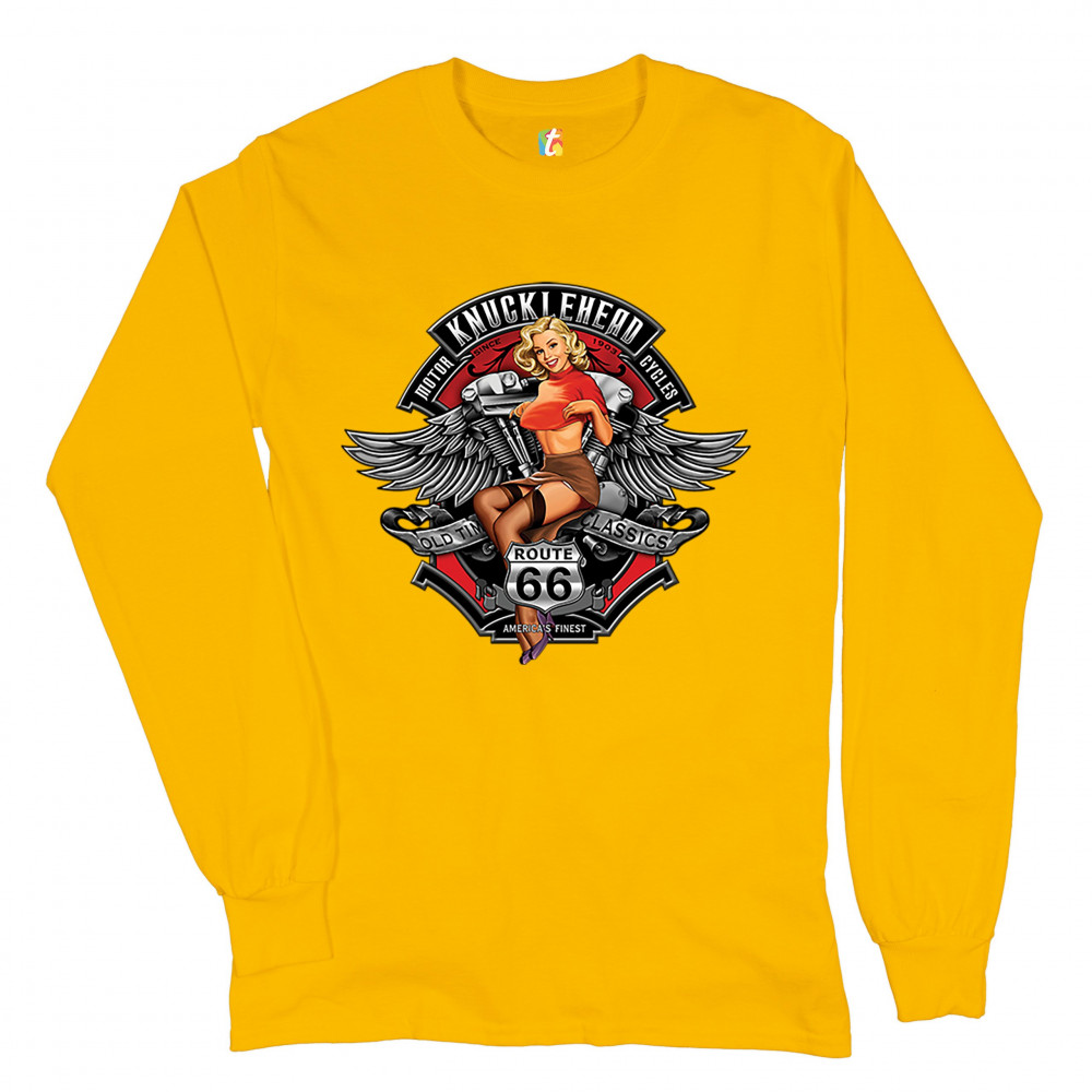 KNUCKLEHEAD MOTORCYCLES long sleeve t-shirt old time classics pin-up girl biker yellow