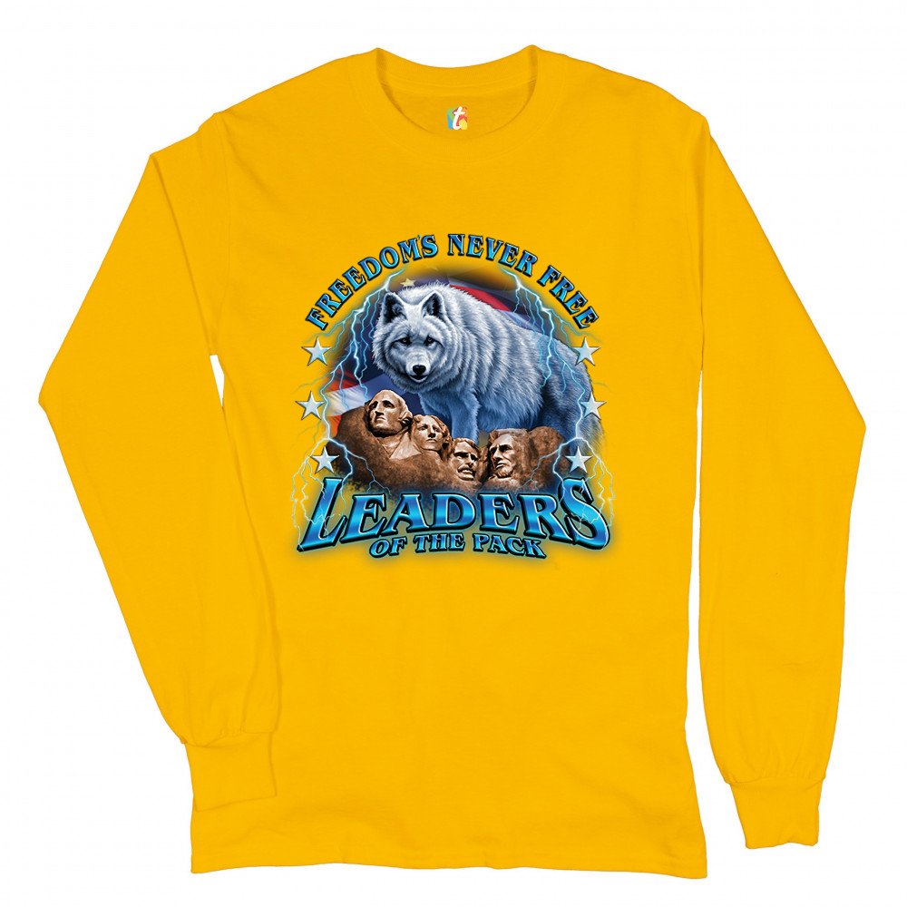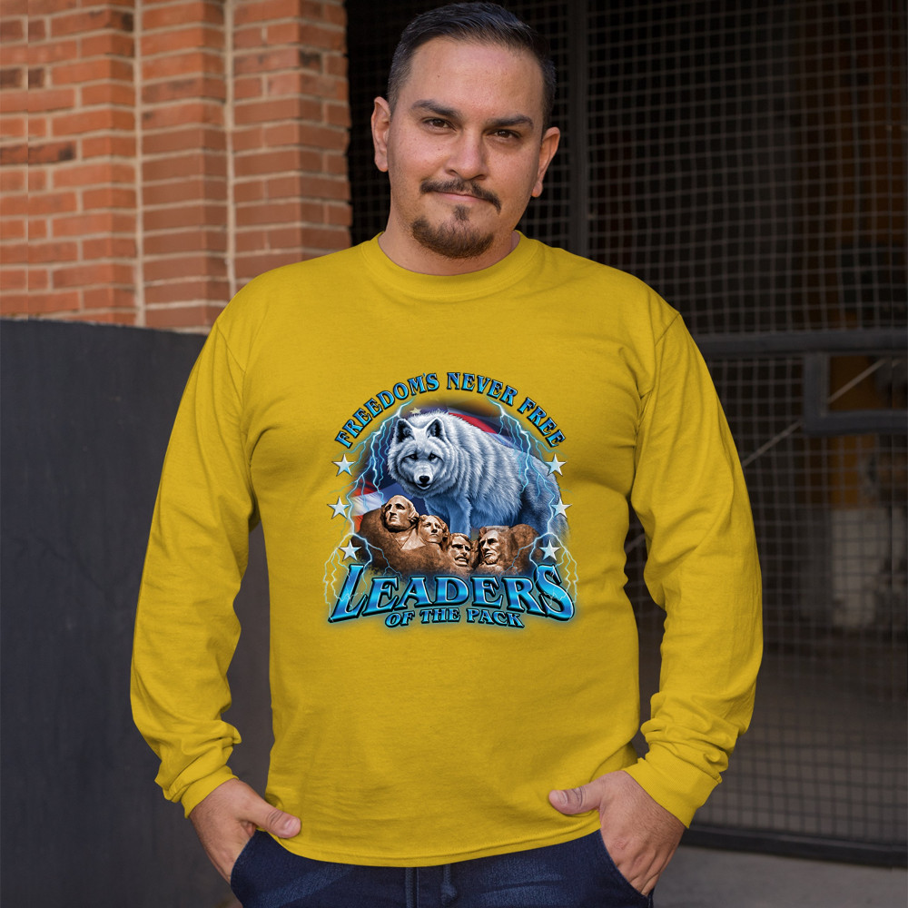 A patriotic print featuring the Mount Rushmore. There is a huge white wolf with the American flag in the background and lightning strikes all over the place. The print says: "Freedom's Never Free, Leaders of the Pack". Great choice to wear on Independence
