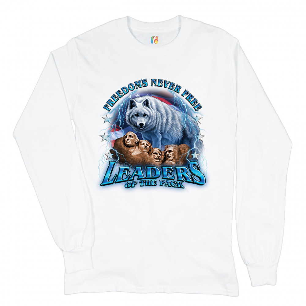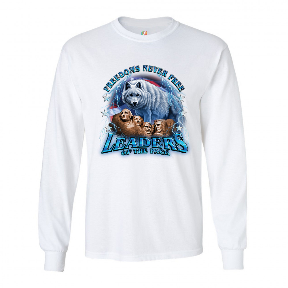 A patriotic print featuring the Mount Rushmore. There is a huge white wolf with the American flag in the background and lightning strikes all over the place. The print says: "Freedom's Never Free, Leaders of the Pack". Great choice to wear on Independence