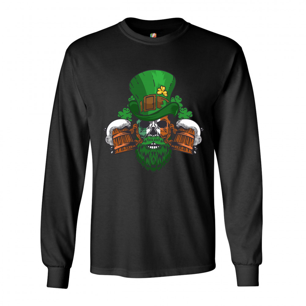 A print featuring a skull with green beard and Irish flag face. The skull is wearing a leprechaun hat. There are two beer mugs and numerous shamrocks around the skull. A great choice to wear on March 17 to celebrate the St. Patrick's Day and showcase your