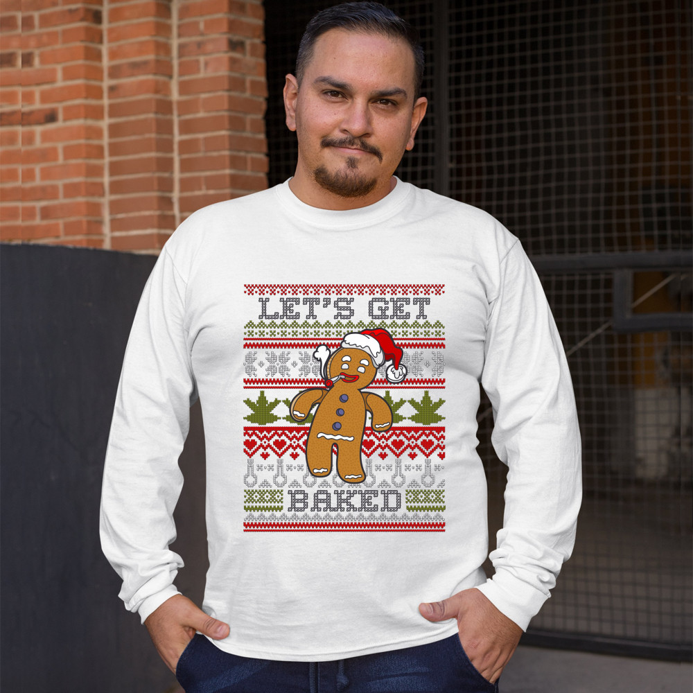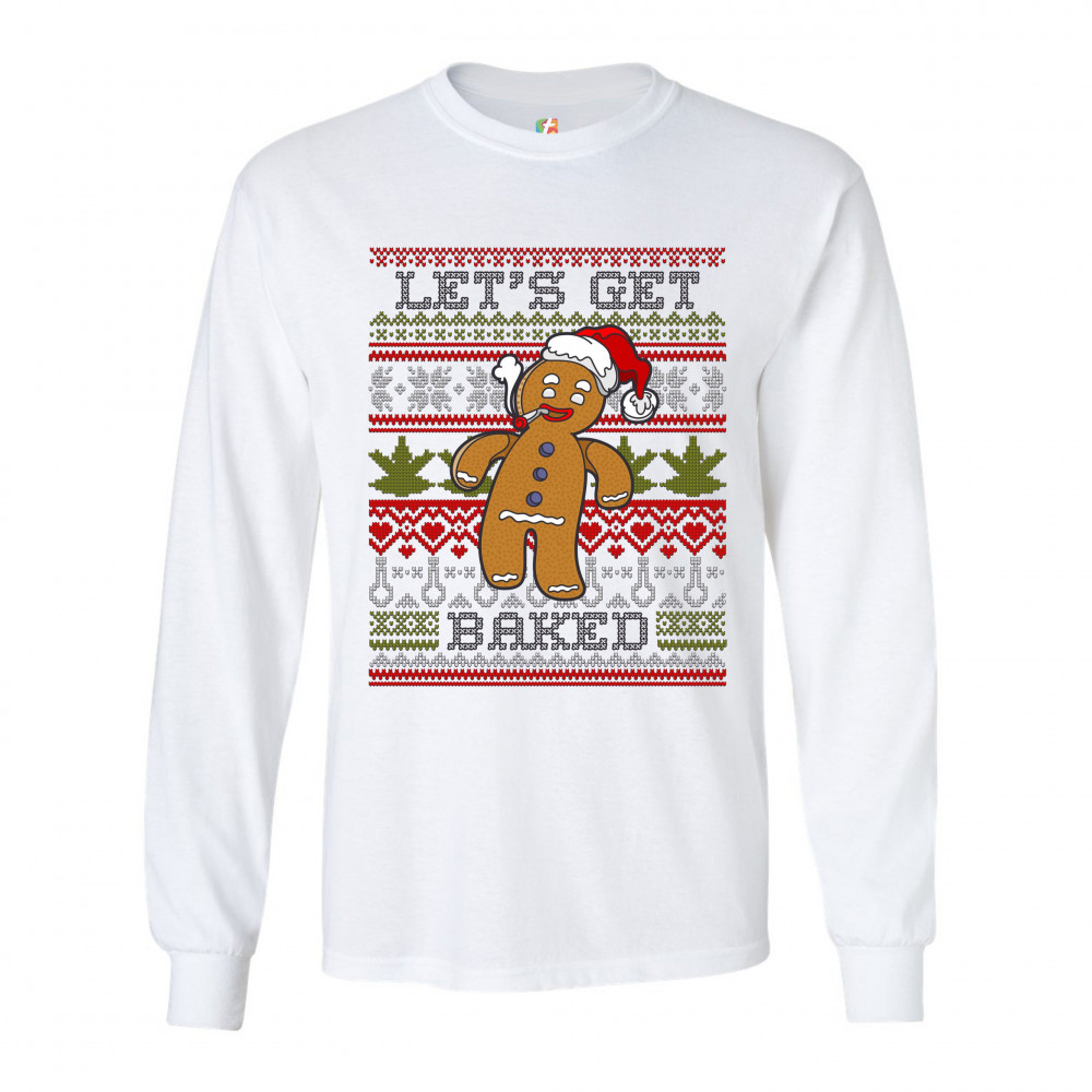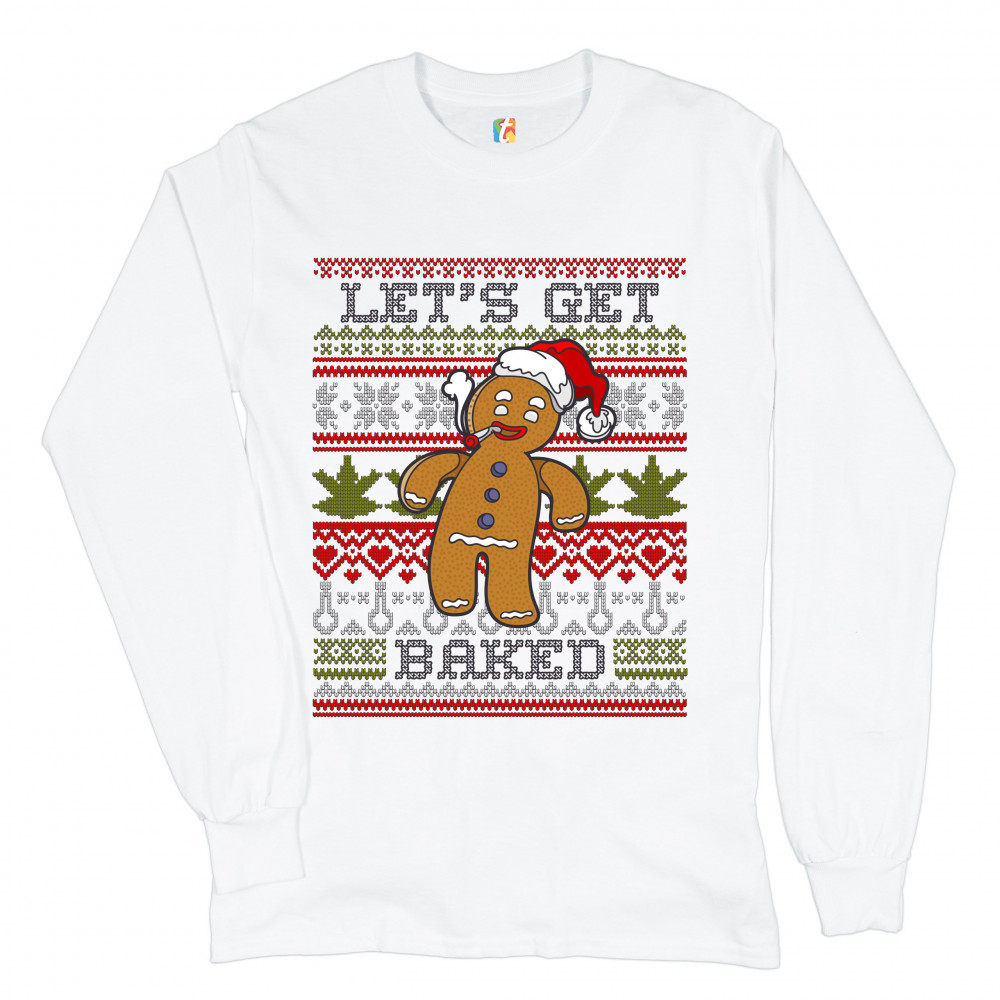 LET'S GET BAKED long sleeve t-shirt ugly sweater gingerbread man 420 marijuana white
