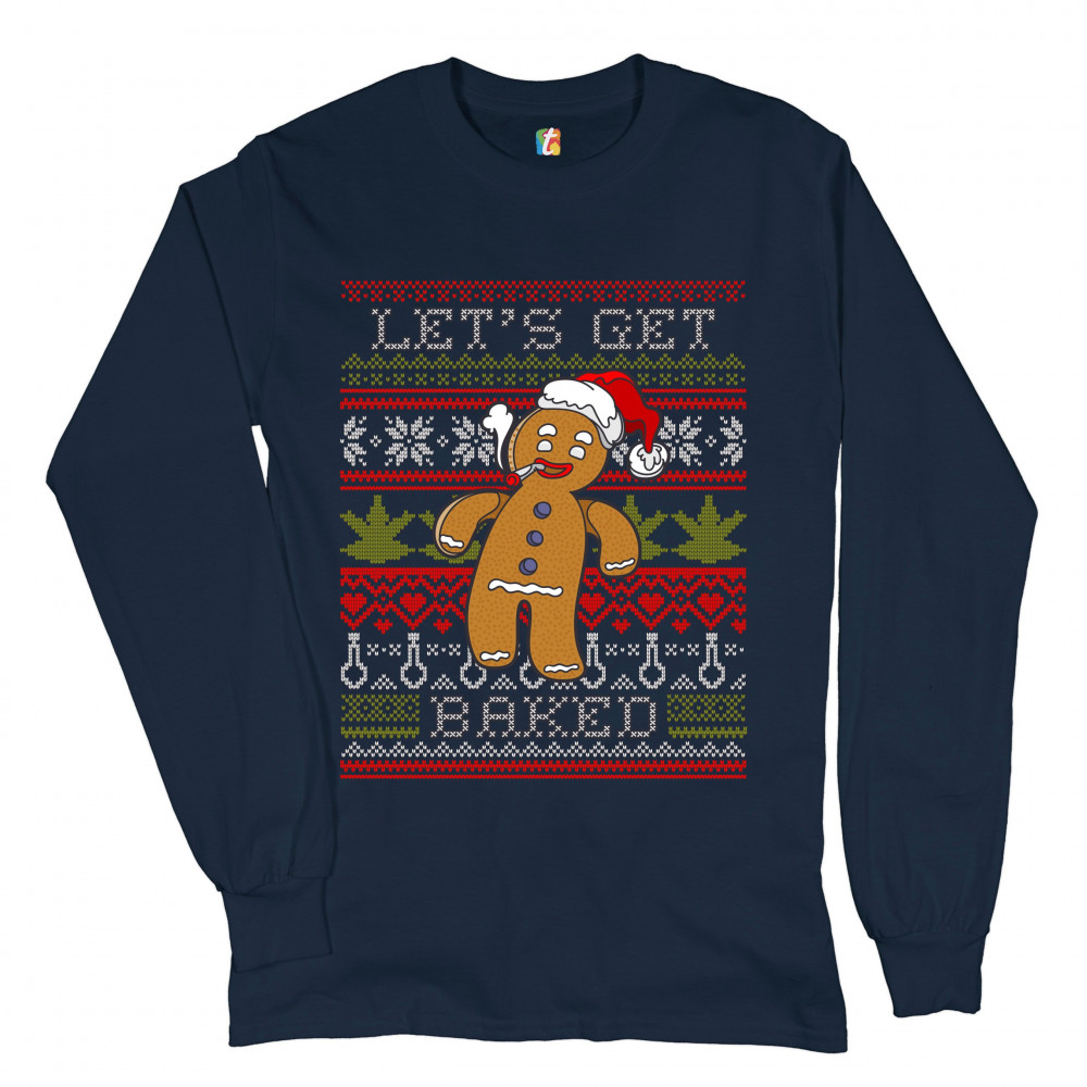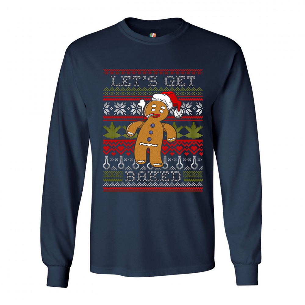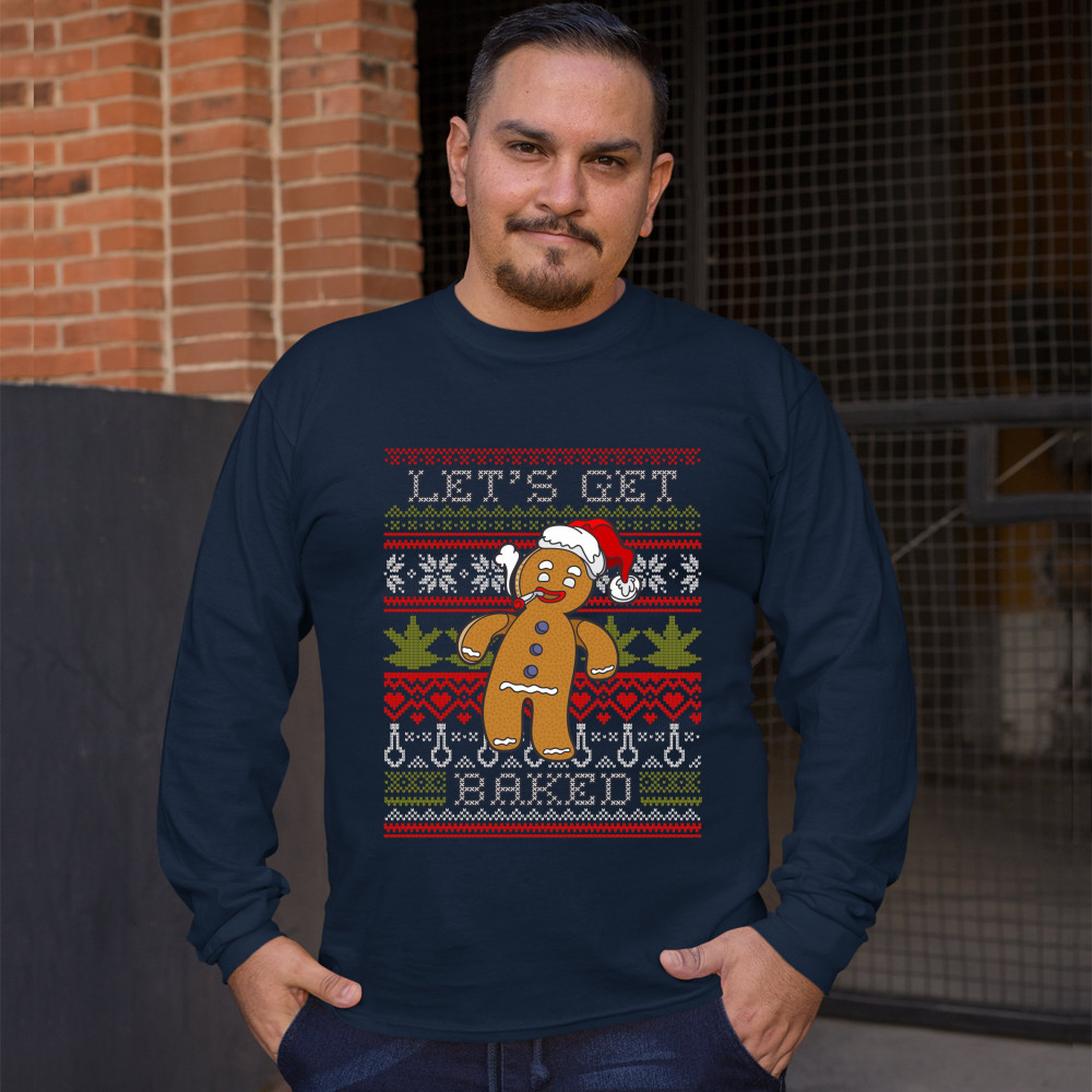 LET'S GET BAKED long sleeve t-shirt ugly sweater gingerbread man 420 marijuana navy blue
