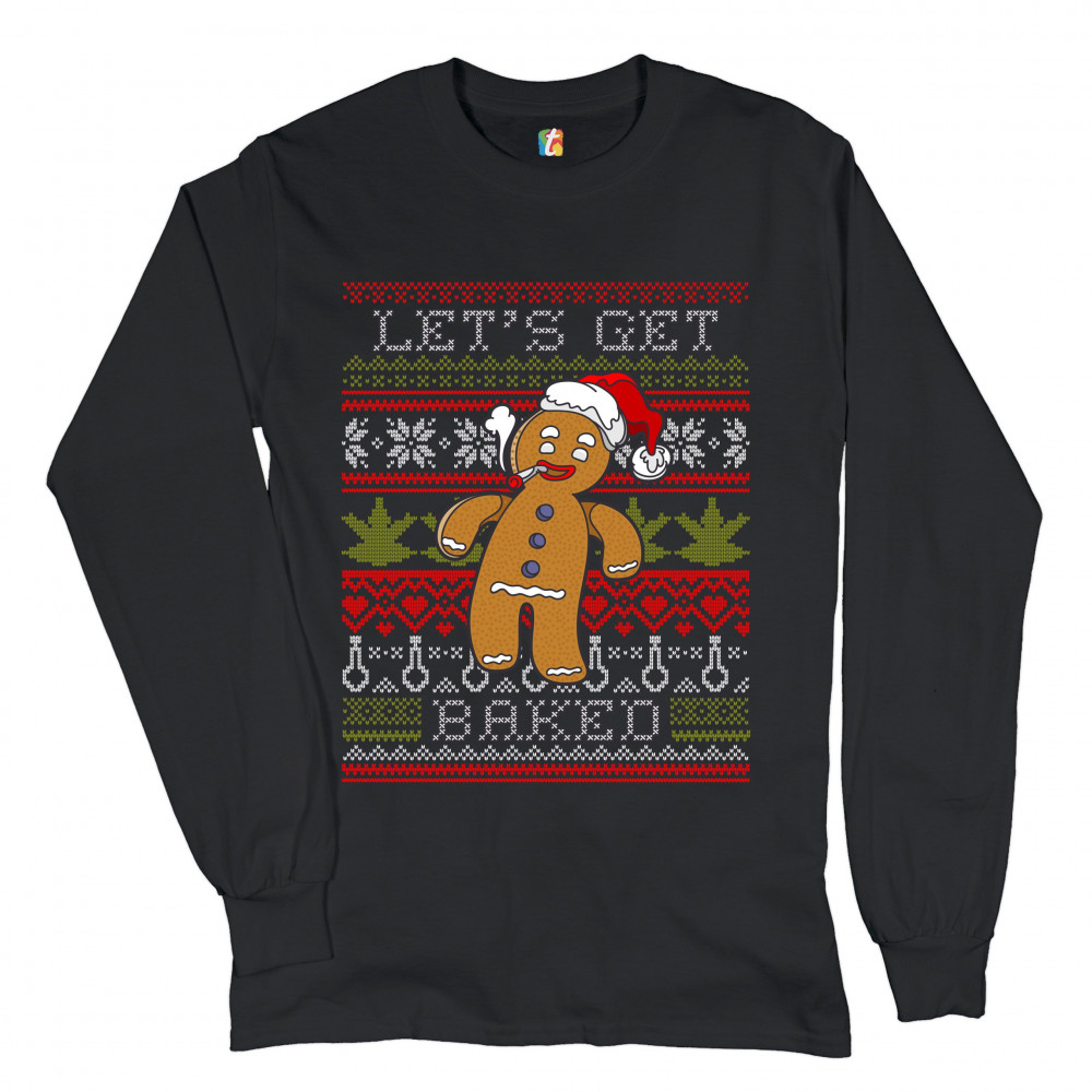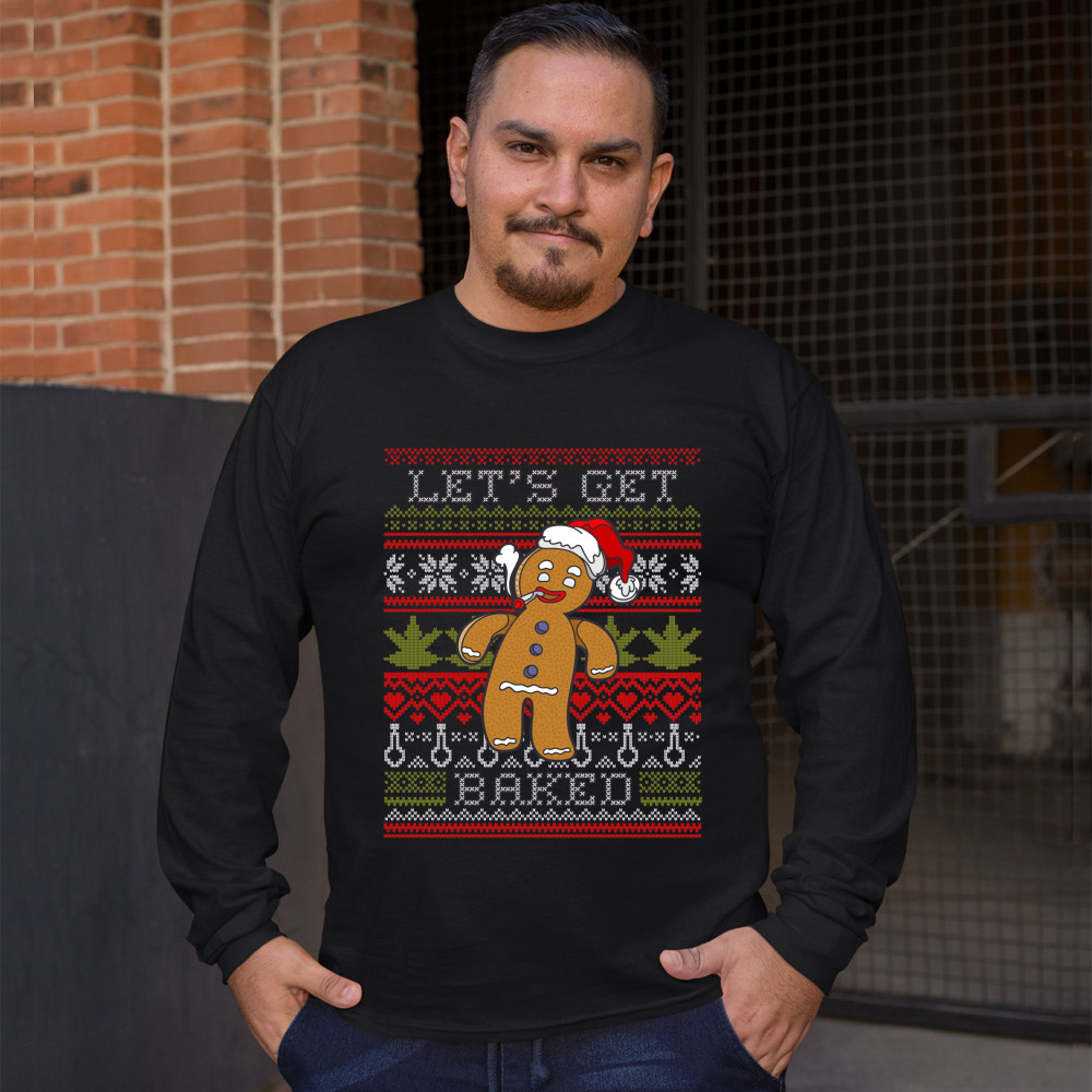 LET'S GET BAKED long sleeve t-shirt ugly sweater gingerbread man 420 marijuana black