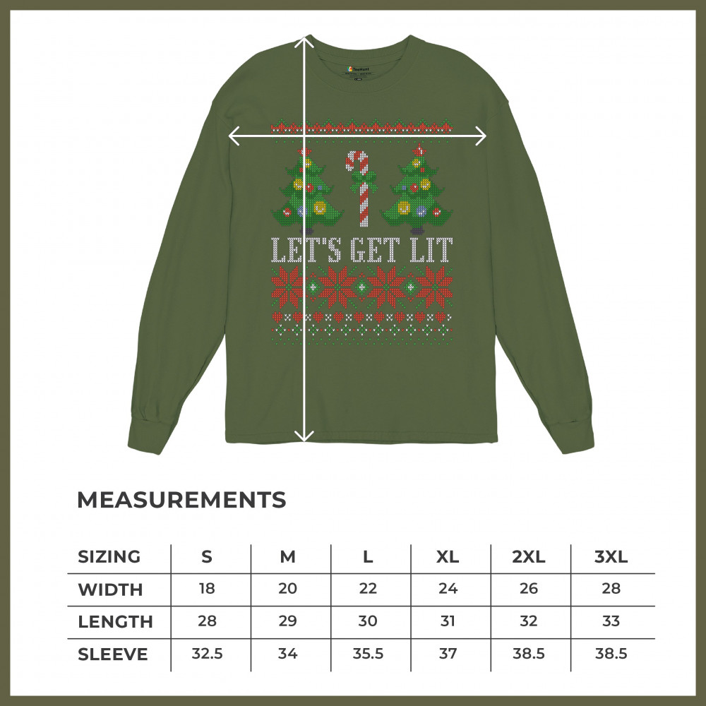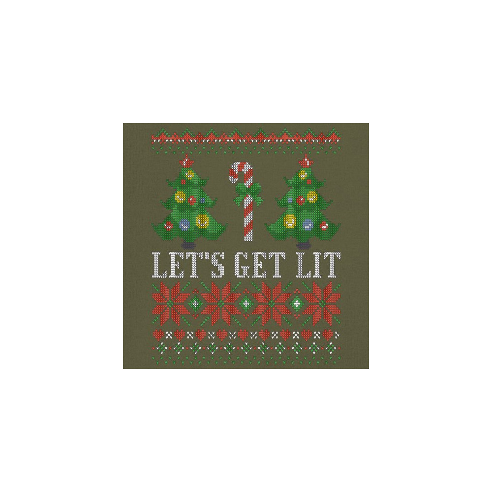 A print saying: "Let's Get Lit" and depicting two Christmas trees and a candy cane between them. The print is decorated as an ugly sweater. A great choice for a Christmas eve celebration.