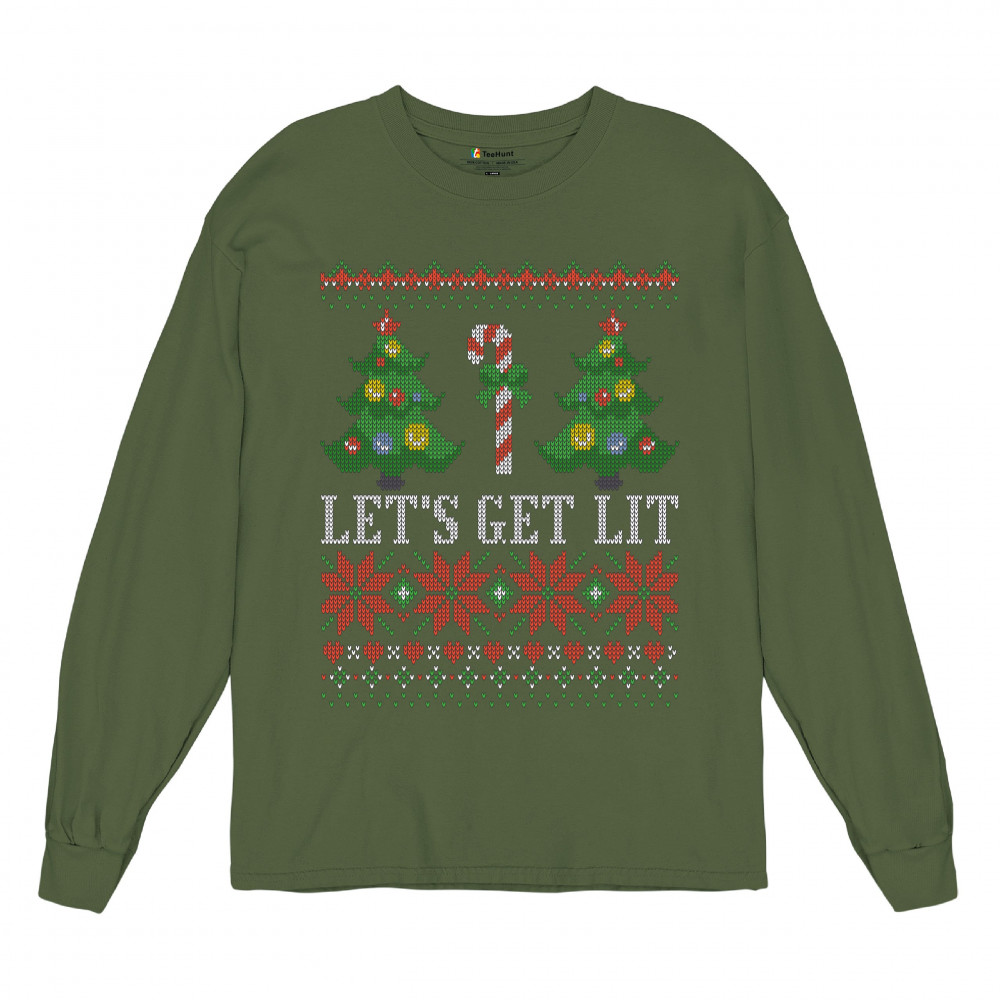 LET'S GET LIT long sleeve t-shirt ugly sweater merry christmas candy cane military green