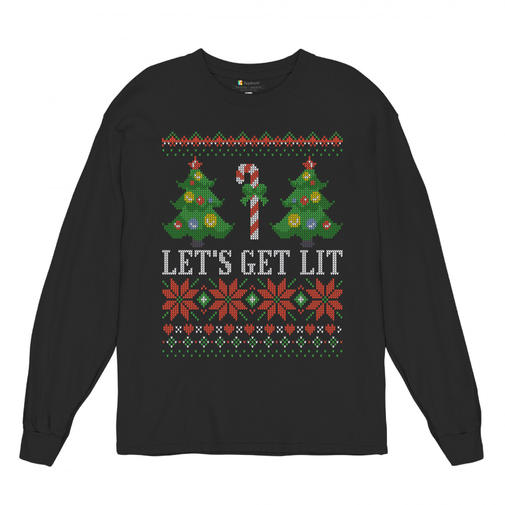 LET'S GET LIT long sleeve t-shirt ugly sweater merry christmas candy cane black