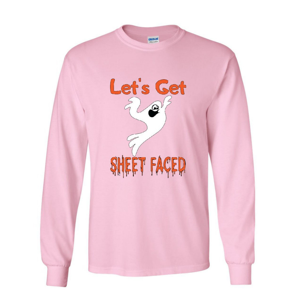 LET'S GET SHEET FACED long sleeve t-shirt funny drinking ghost halloween boo tee light pink
