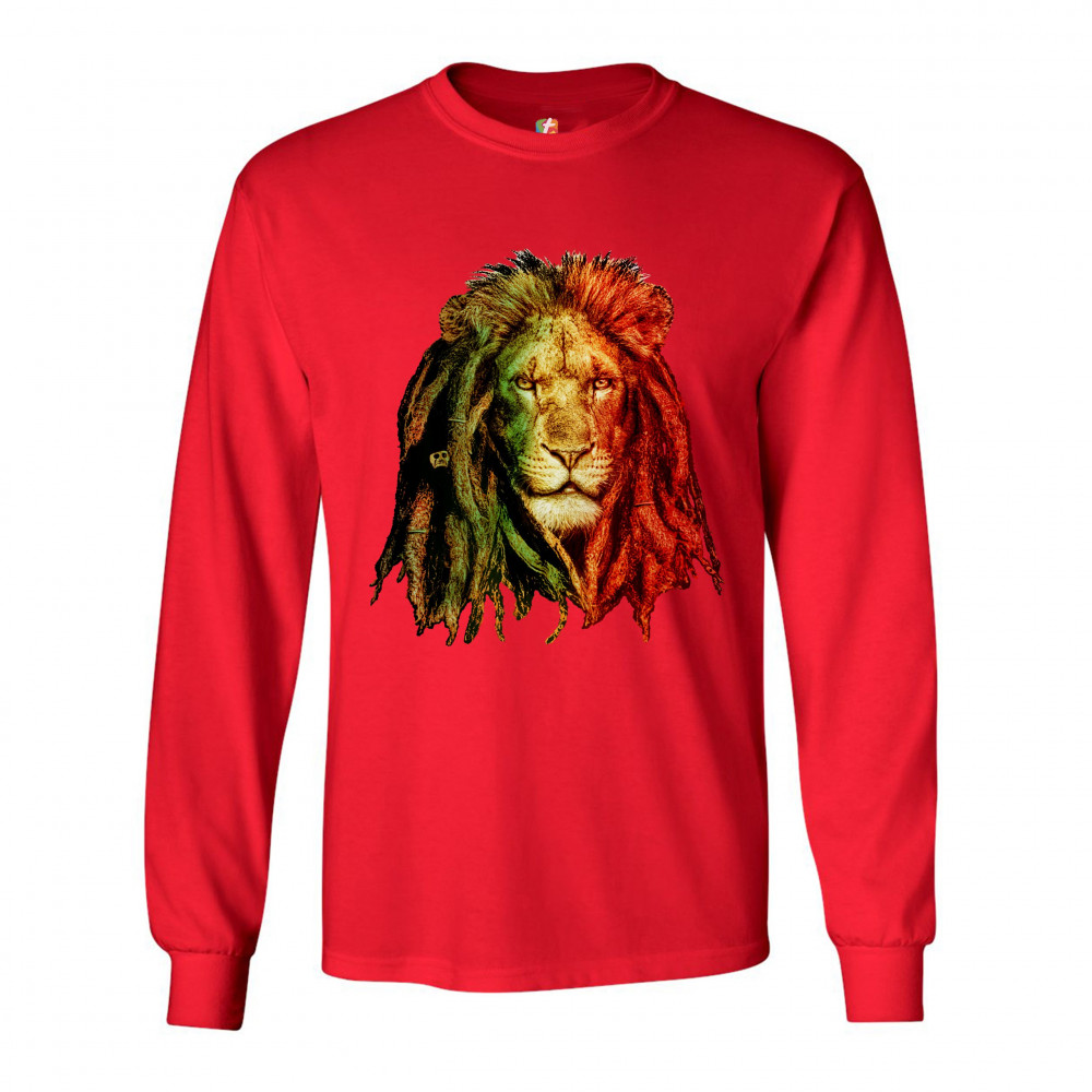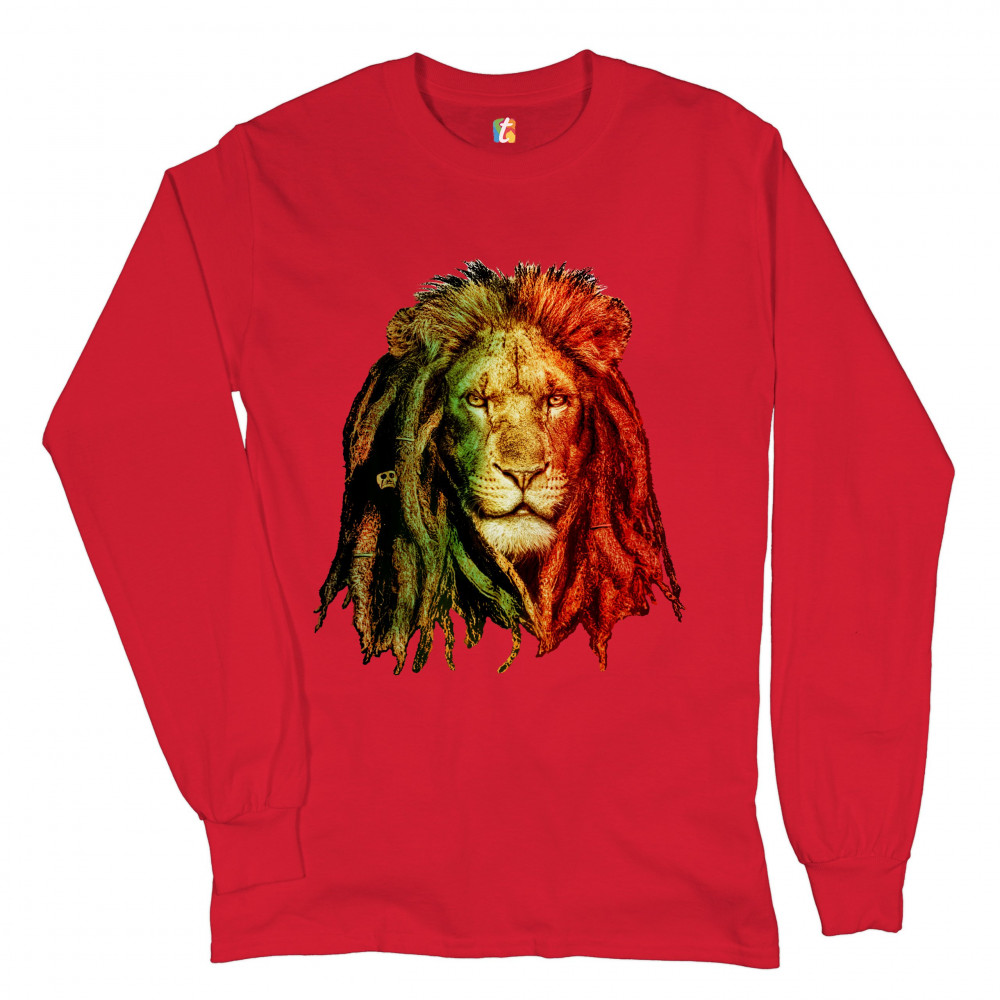 LION WITH DREADLOCKS long sleeve t-shirt rastafari jah jamaica marijuana 420 red