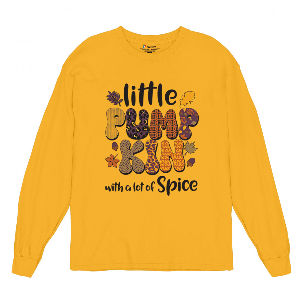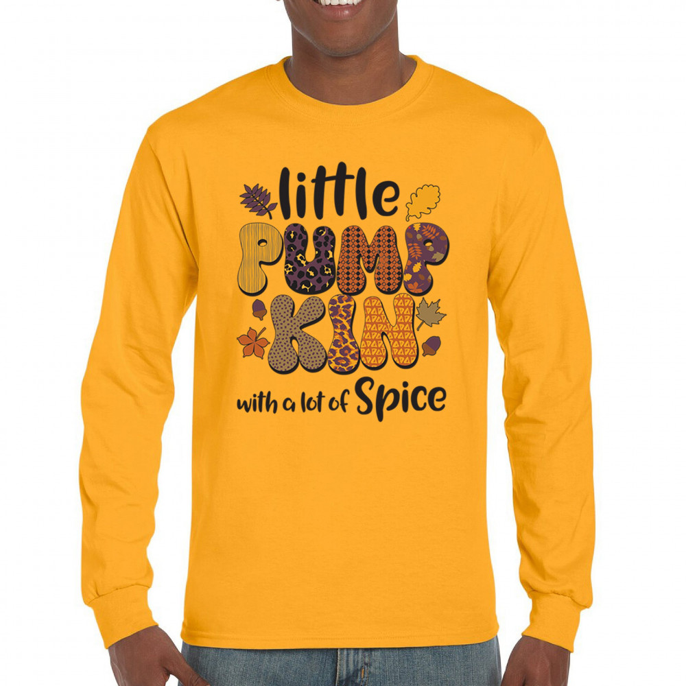 Celebrate the fall season with this playful 'Little Pumpkin with a Lot of Spice' design, perfect for festive gatherings and pumpkin patch visits.