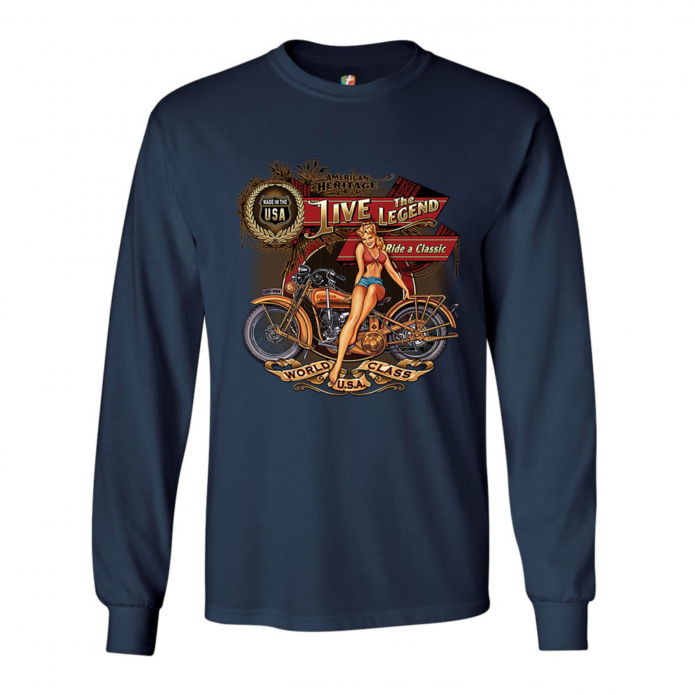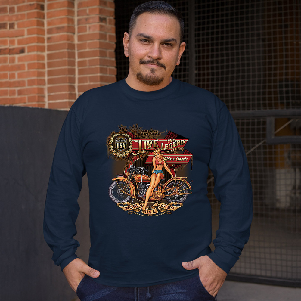 LIVE THE LEGEND long sleeve t-shirt biker retro motorcycle pin-up girl route 66 navy blue