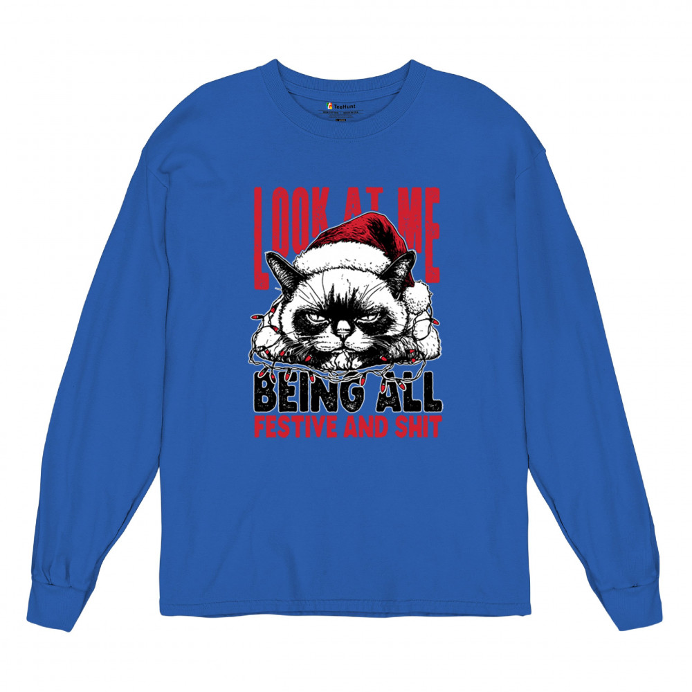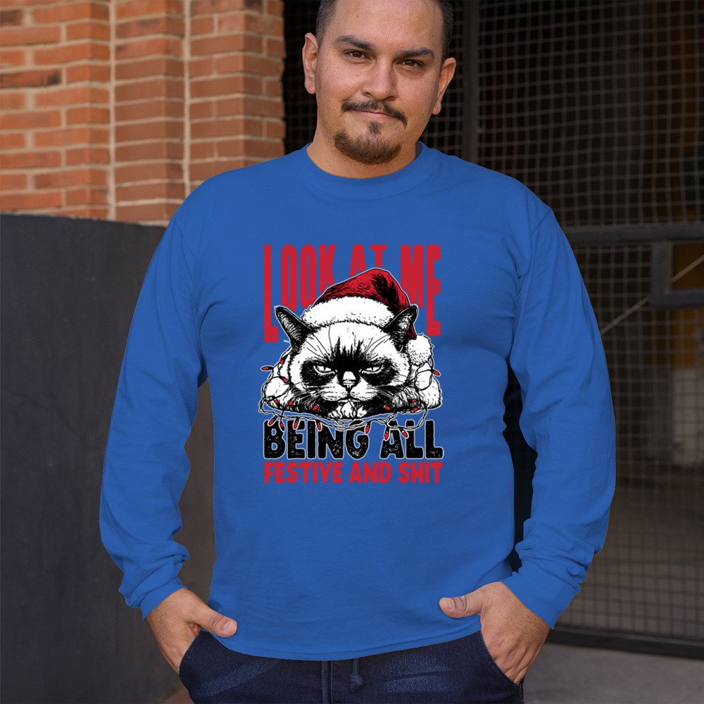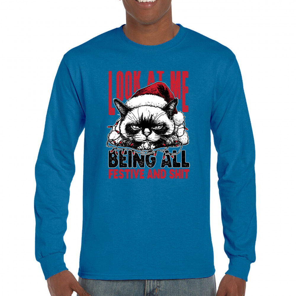 Grumpy Cat Christmas design with Santa hat, Christmas tree humor, Let It Snow vibes, Jingle Bells style, and sarcastic Merry Xmas spirit.