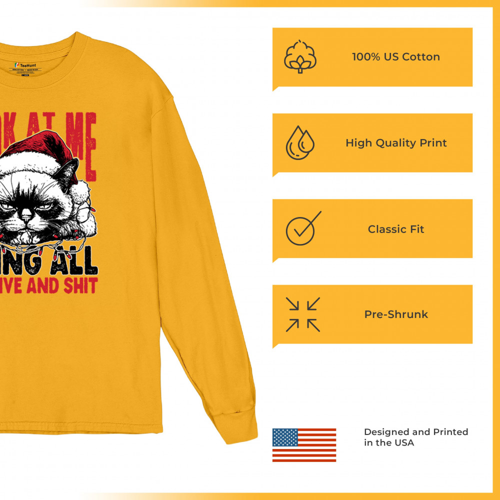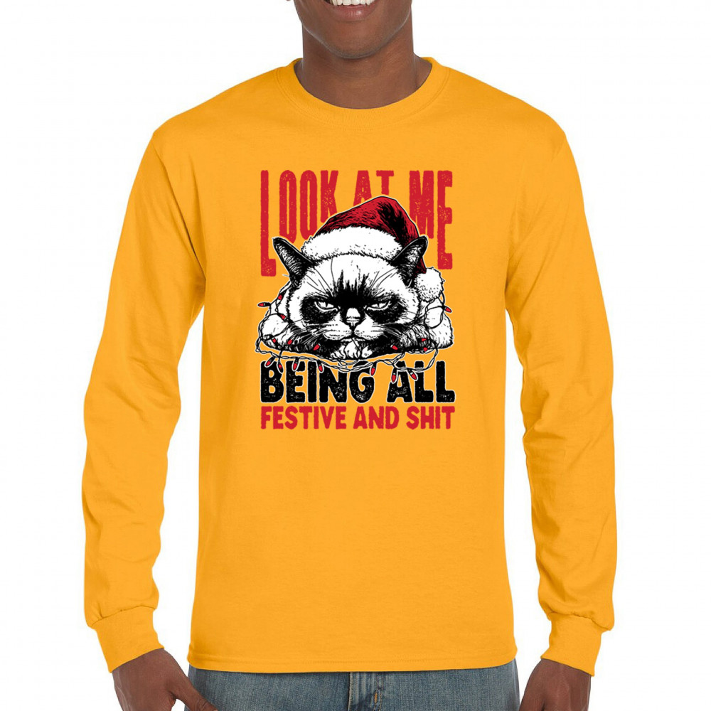 Grumpy Cat Christmas design with Santa hat, Christmas tree humor, Let It Snow vibes, Jingle Bells style, and sarcastic Merry Xmas spirit.