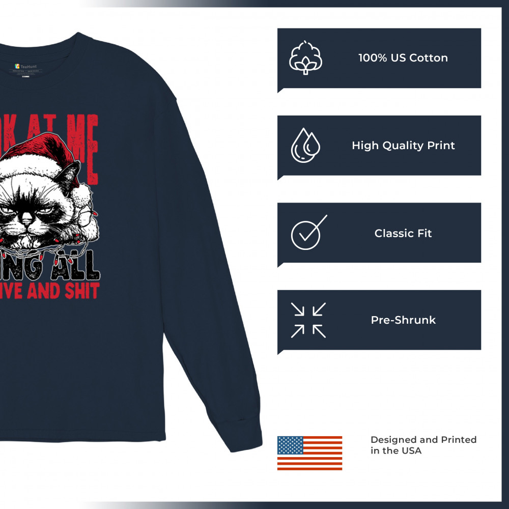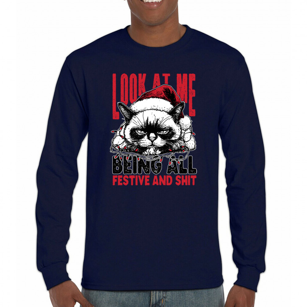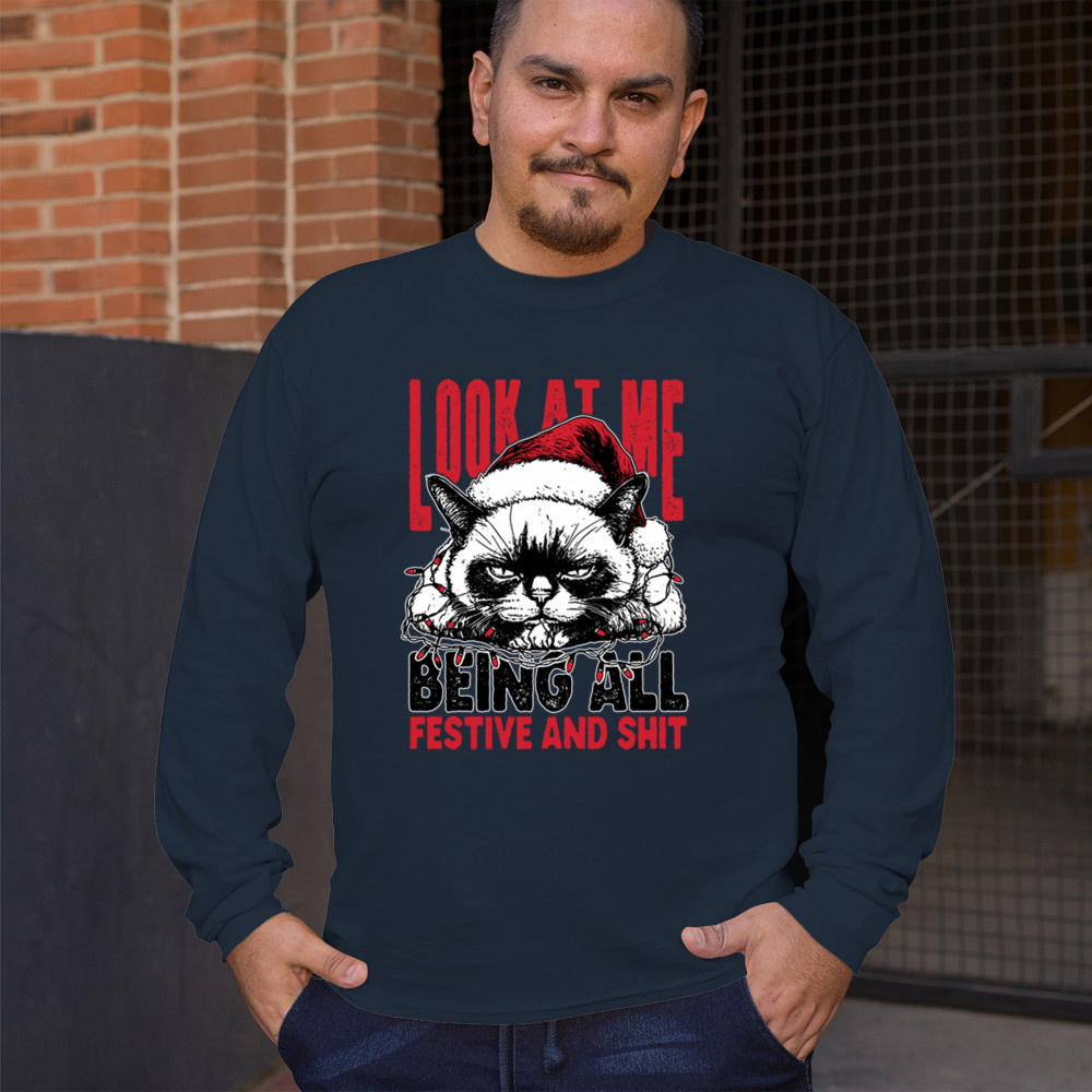Grumpy Cat Christmas design with Santa hat, Christmas tree humor, Let It Snow vibes, Jingle Bells style, and sarcastic Merry Xmas spirit.