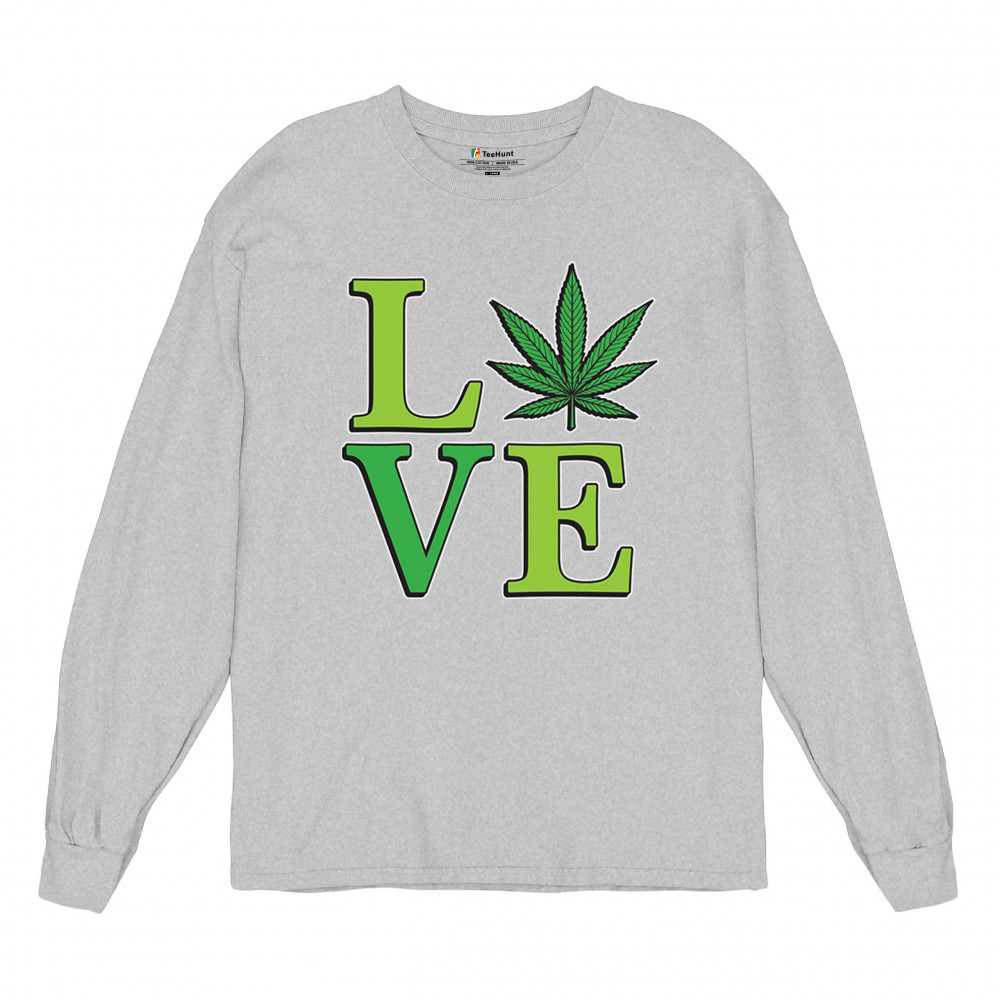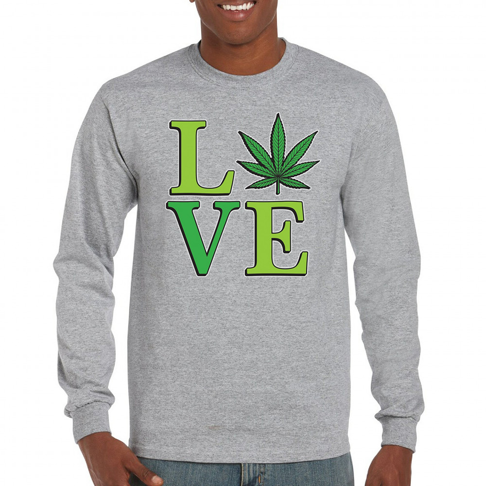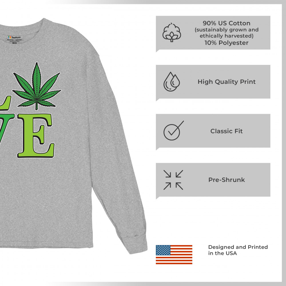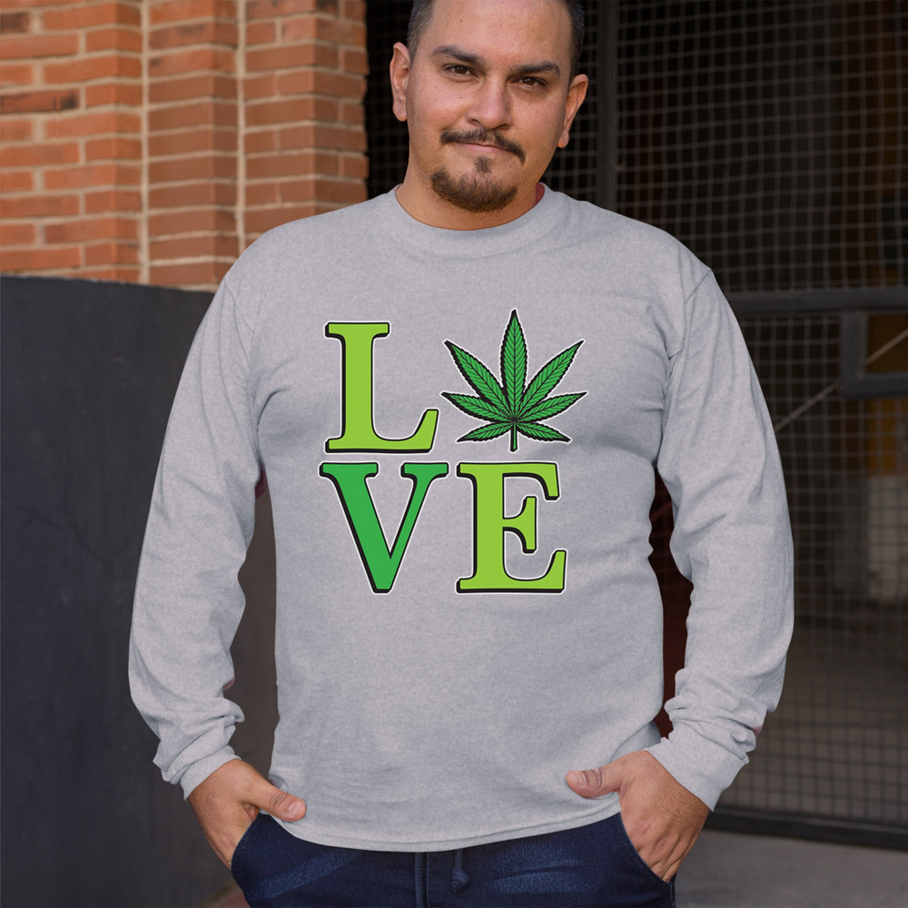 LOVE design with a bold weed leaf. Perfect for 420 fans, stoners, cannabis lifestyle wear, green pride, and marijuana lovers.