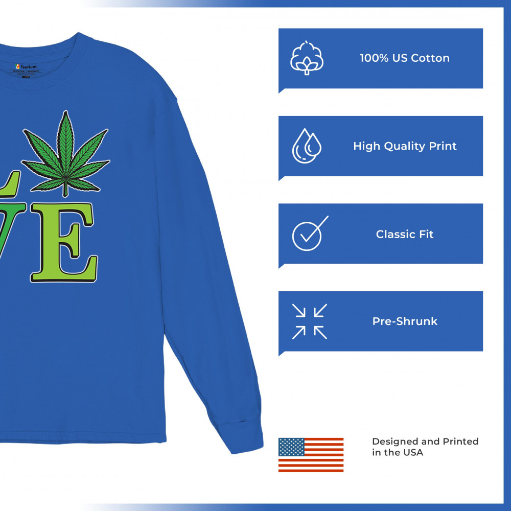 LOVE design with a bold weed leaf. Perfect for 420 fans, stoners, cannabis lifestyle wear, green pride, and marijuana lovers.