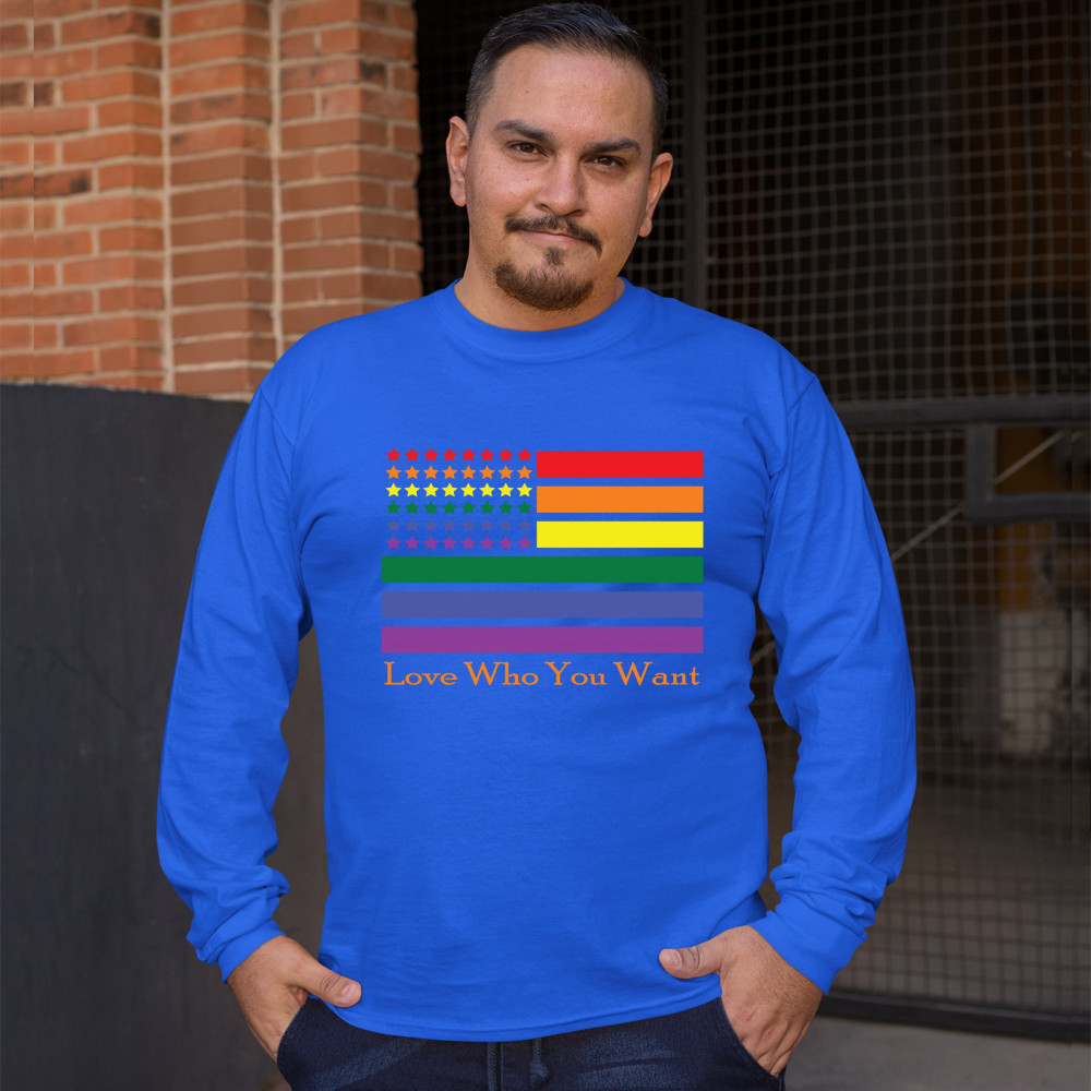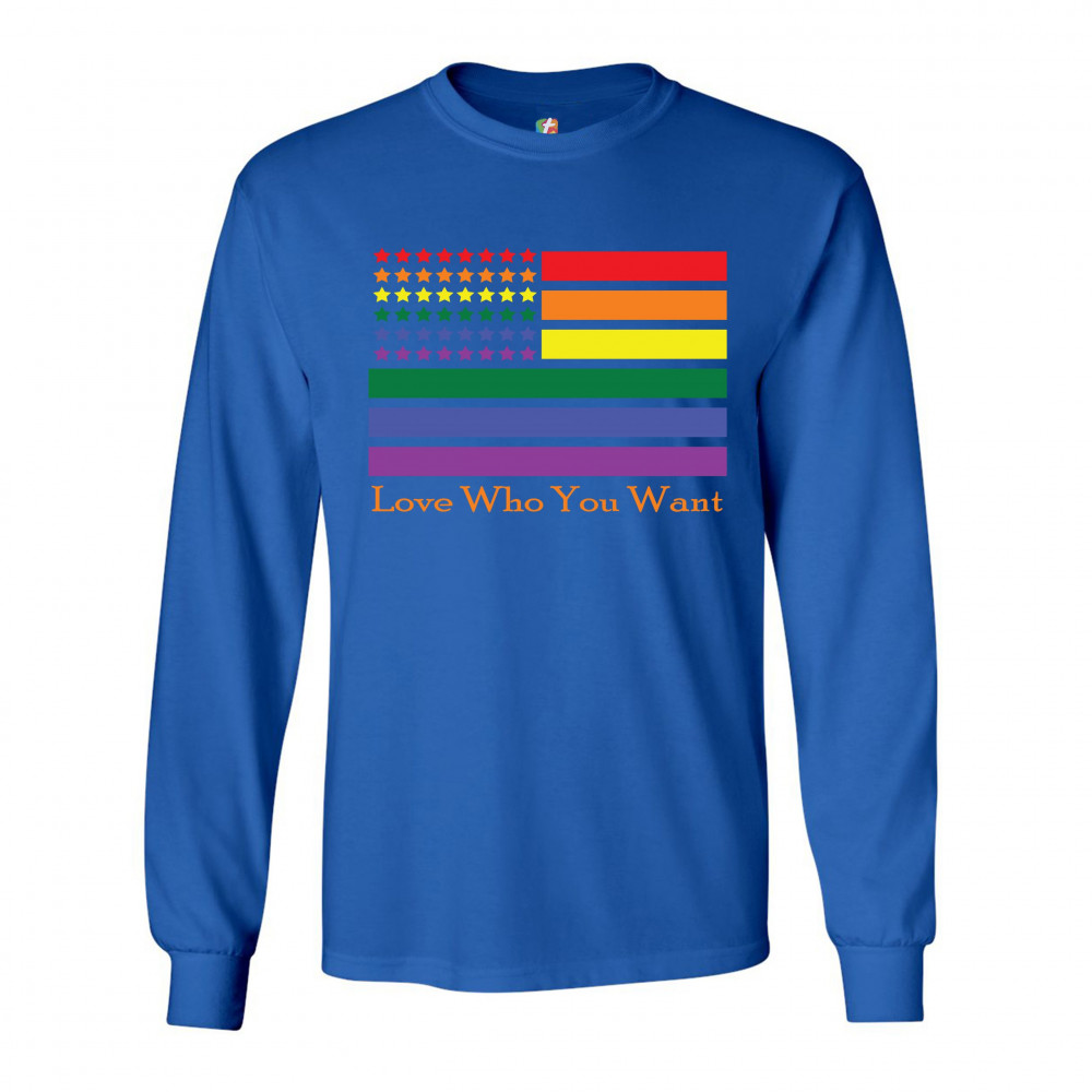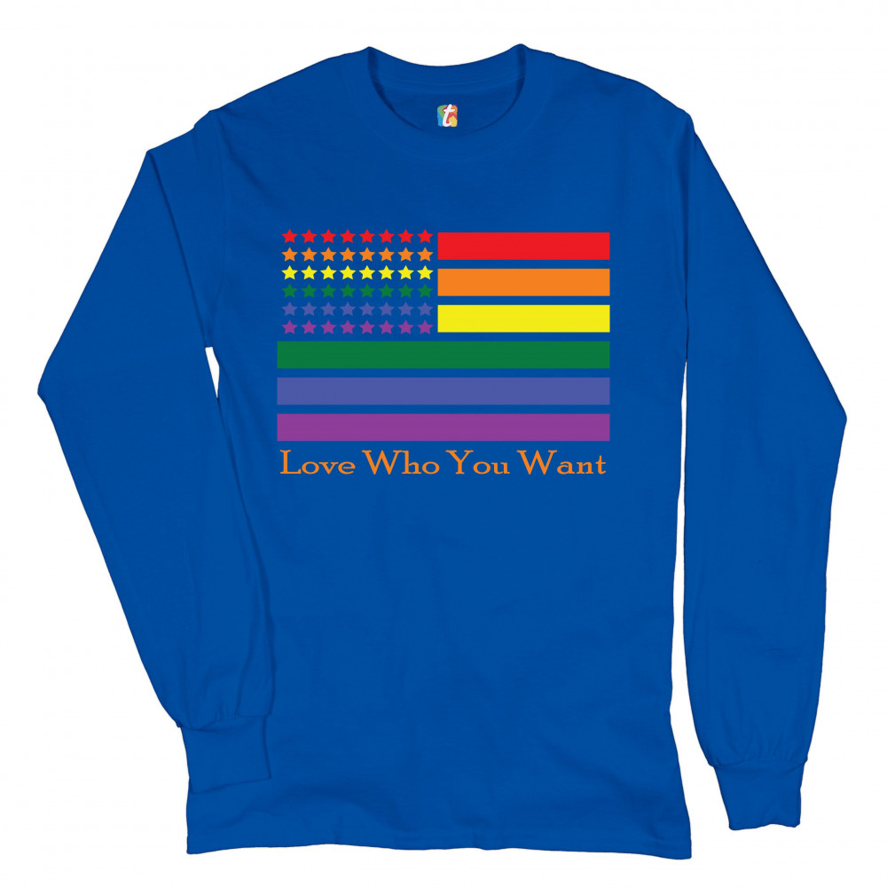 LOVE WHO YOU WANT long sleeve t-shirt american gay pride rainbow flag lgbt royal blue