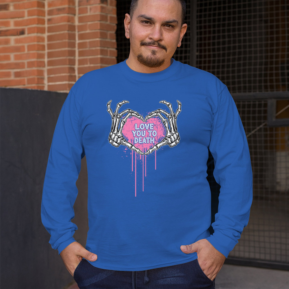 Show your spooky side with this skeleton hands heart design featuring a pink background and the phrase "Love You to Death." A perfect piece for alternative couples, Halloween lovers, and romantic rebels who embrace both affection and dark humor. Great for spooky season, date nights, and alt fashion outfits.