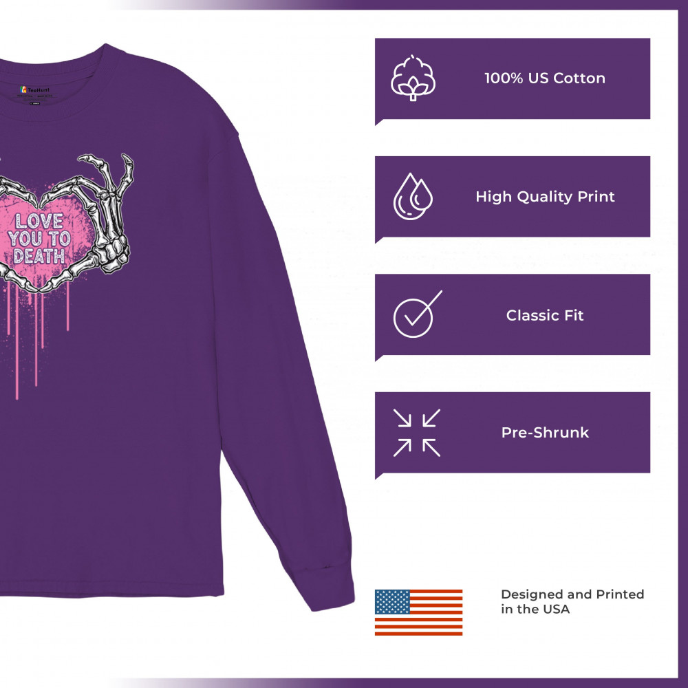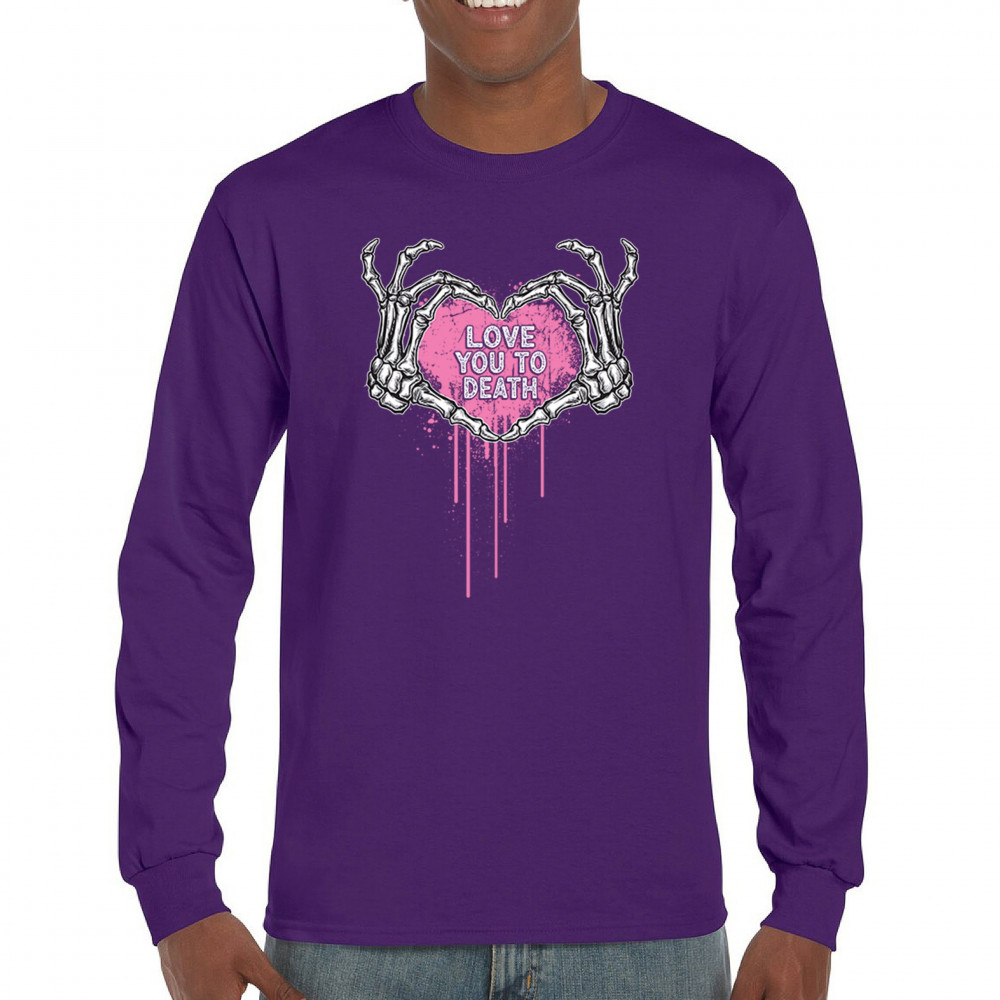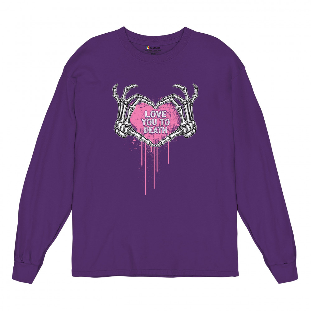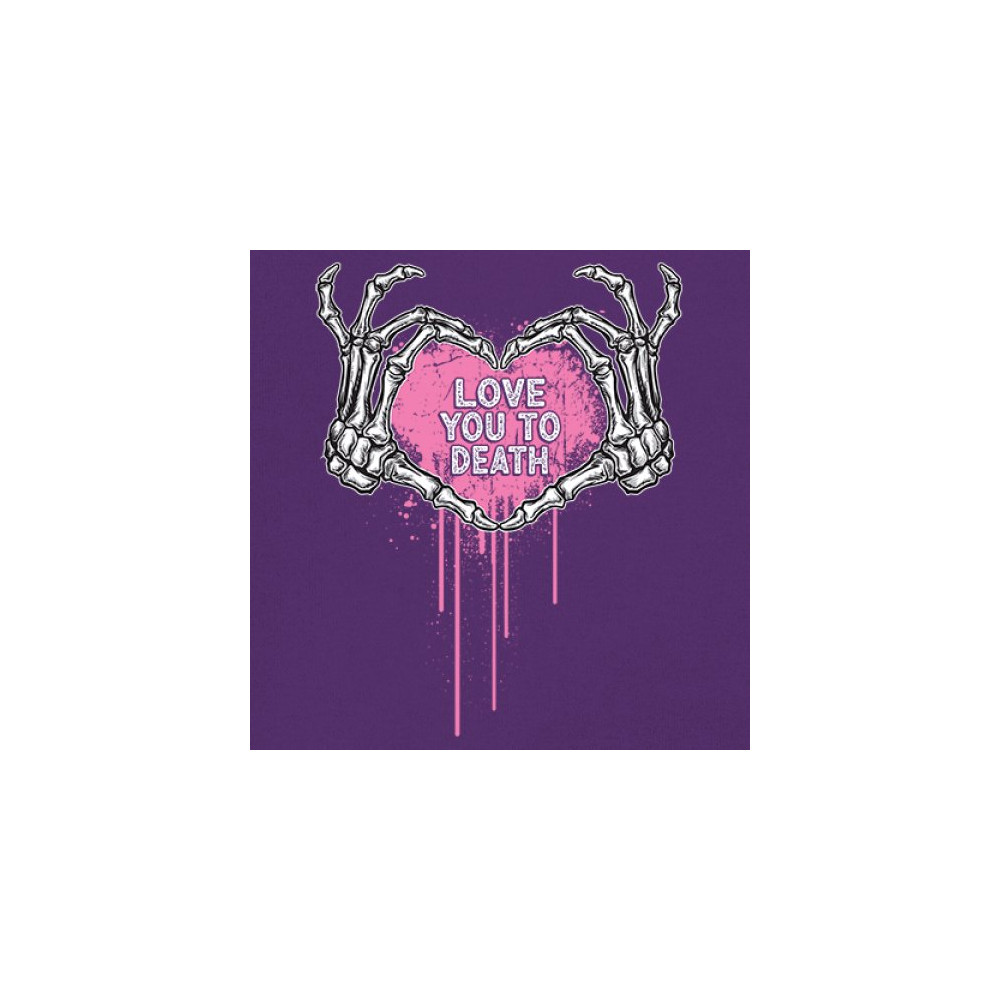 Show your spooky side with this skeleton hands heart design featuring a pink background and the phrase "Love You to Death." A perfect piece for alternative couples, Halloween lovers, and romantic rebels who embrace both affection and dark humor. Great for spooky season, date nights, and alt fashion outfits.
