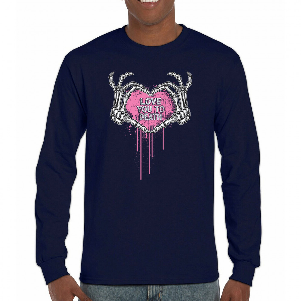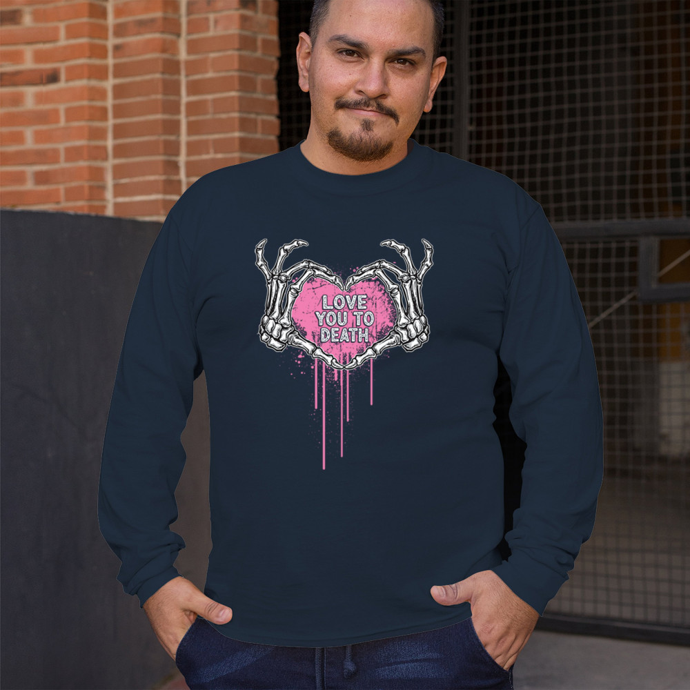 Show your spooky side with this skeleton hands heart design featuring a pink background and the phrase "Love You to Death." A perfect piece for alternative couples, Halloween lovers, and romantic rebels who embrace both affection and dark humor. Great for spooky season, date nights, and alt fashion outfits.