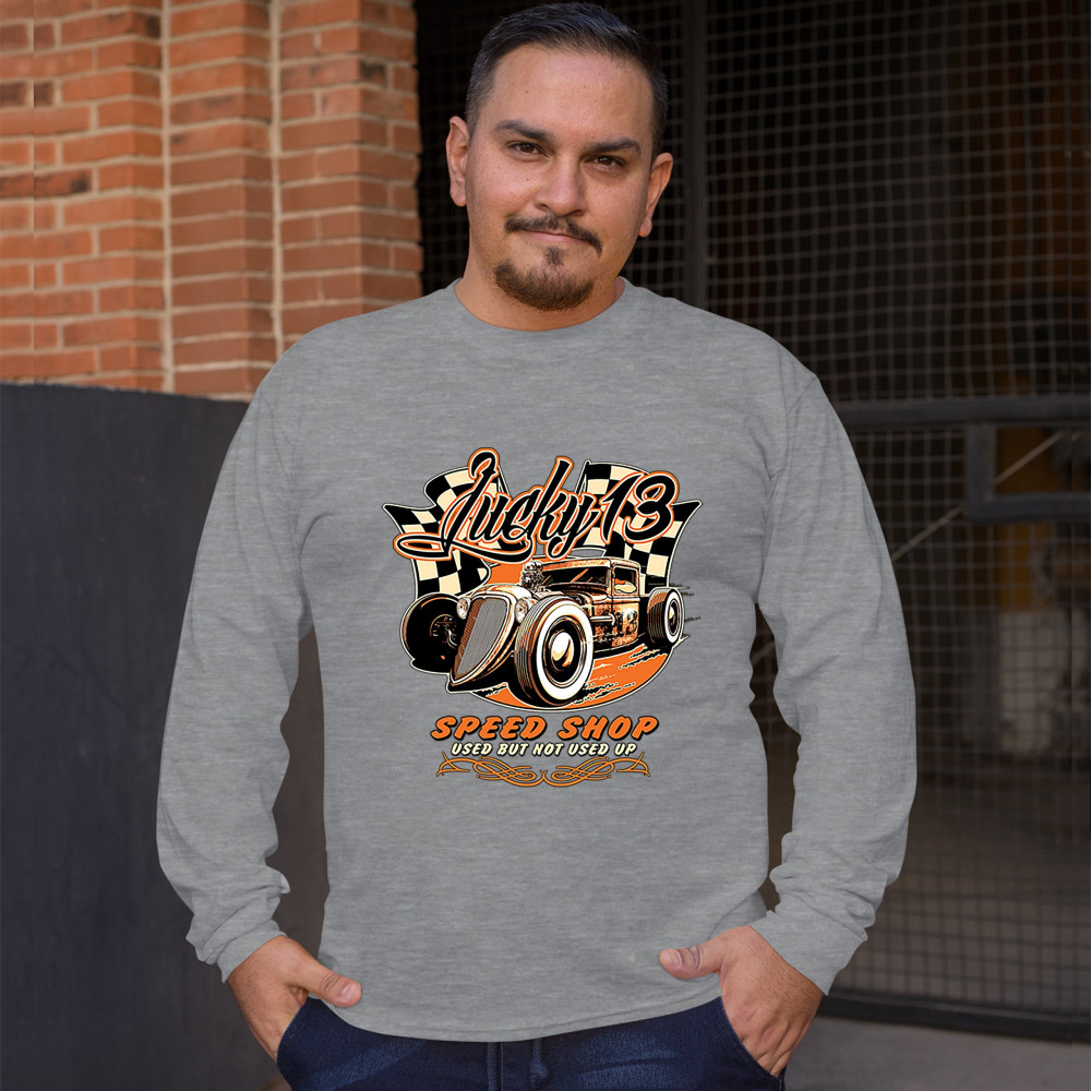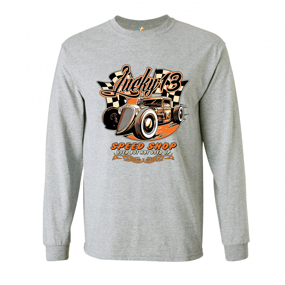 LUCKY 13 SPEED SHOP long sleeve t-shirt rat rod route 66 vintage racing car gray