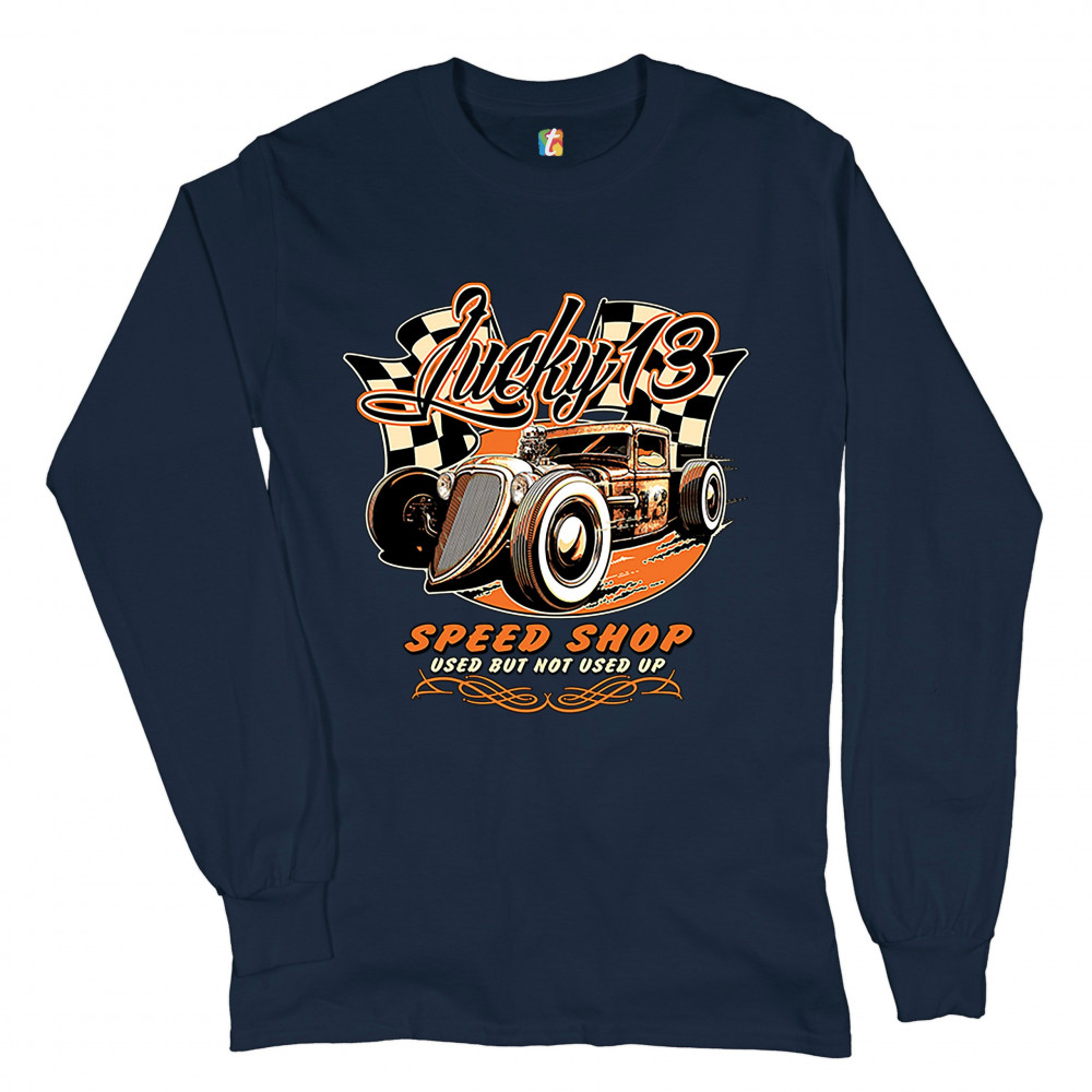 LUCKY 13 SPEED SHOP long sleeve t-shirt rat rod route 66 vintage racing car navy blue
