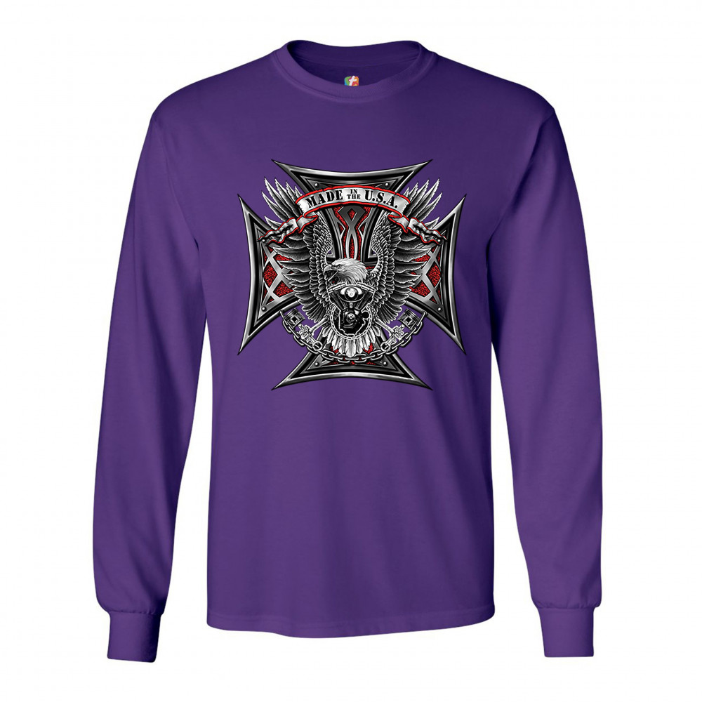 A print featuring a huge cross. In the front there is a bald eagle spreading it's wings and holding pistons in it's talons. In front of it's chest there is a V engine. At the top there is a stripe with "Made in the USA" written on it. A great choice for a