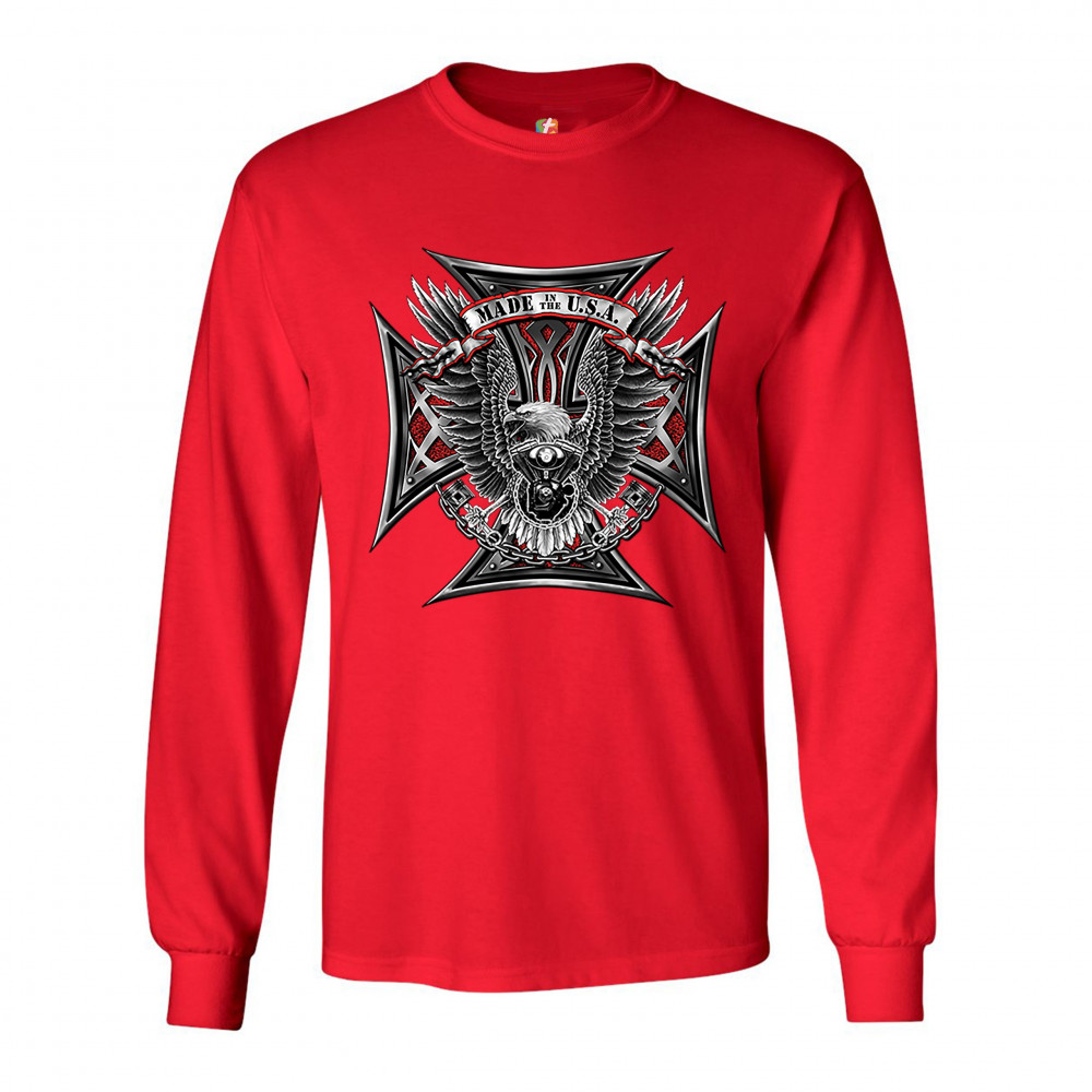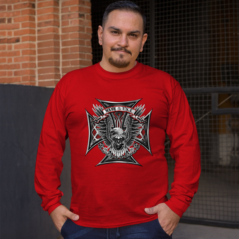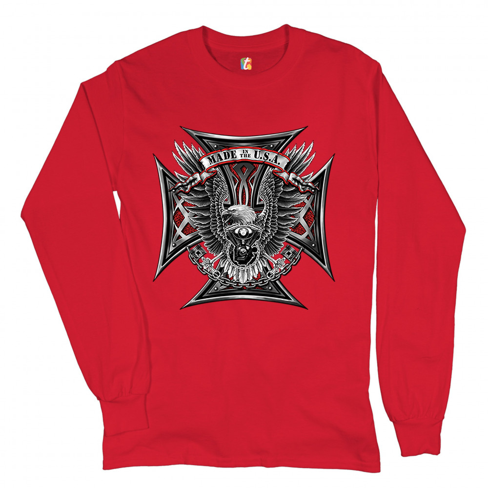 A print featuring a huge cross. In the front there is a bald eagle spreading it's wings and holding pistons in it's talons. In front of it's chest there is a V engine. At the top there is a stripe with "Made in the USA" written on it. A great choice for a