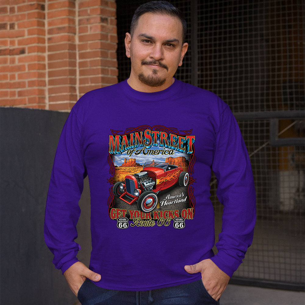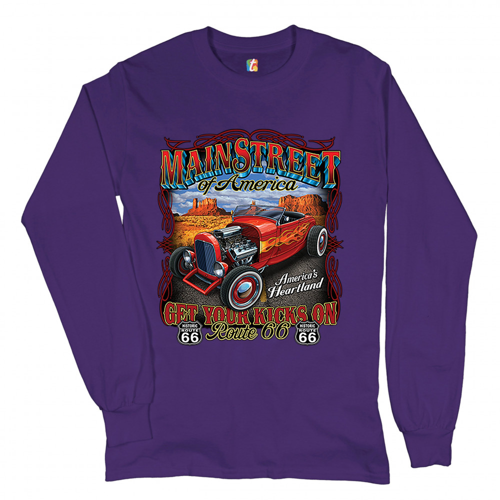 MAIN STREET OF AMERICA long sleeve t-shirt america's heartland route 66 hot rod purple