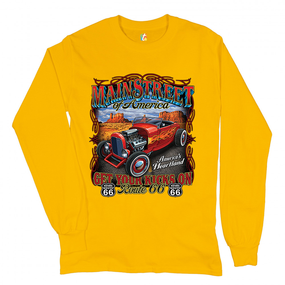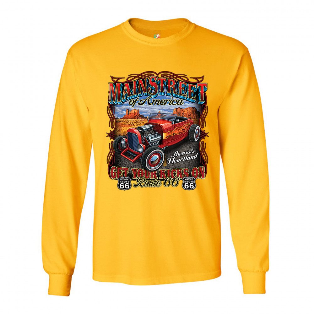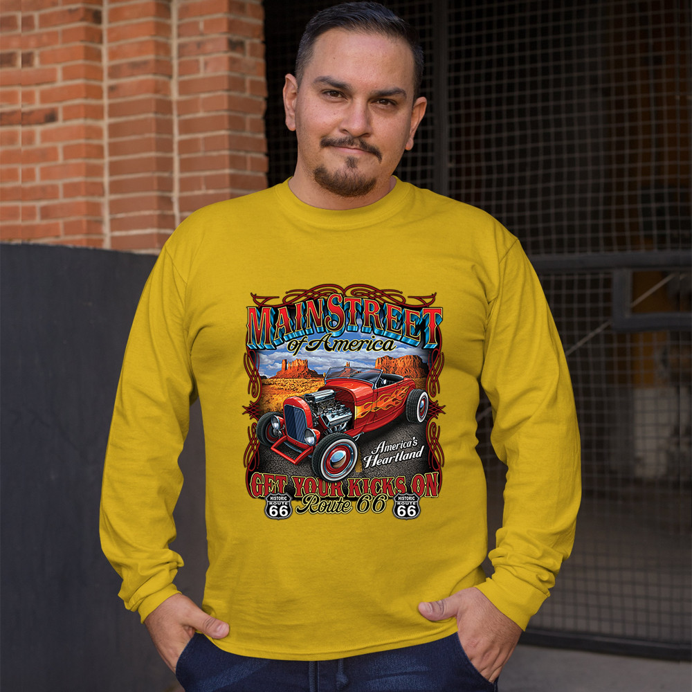 MAIN STREET OF AMERICA long sleeve t-shirt america's heartland route 66 hot rod yellow