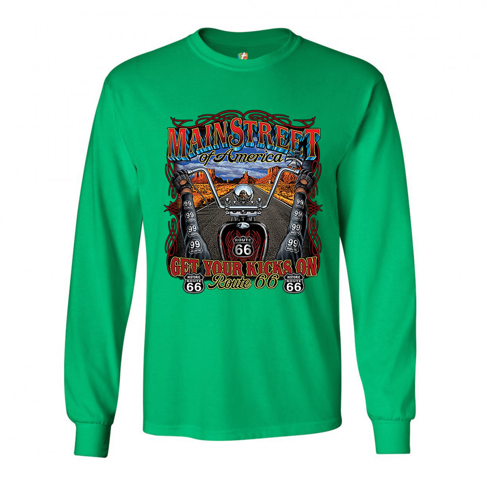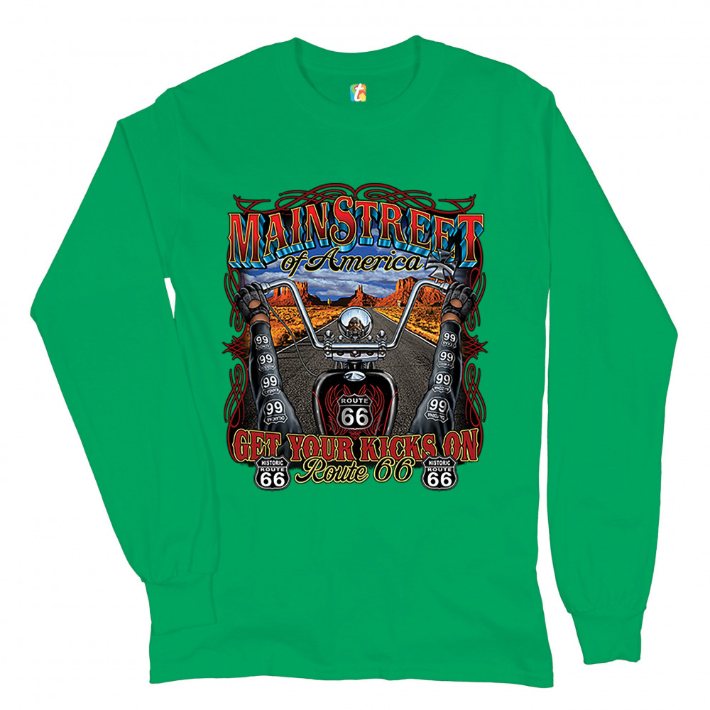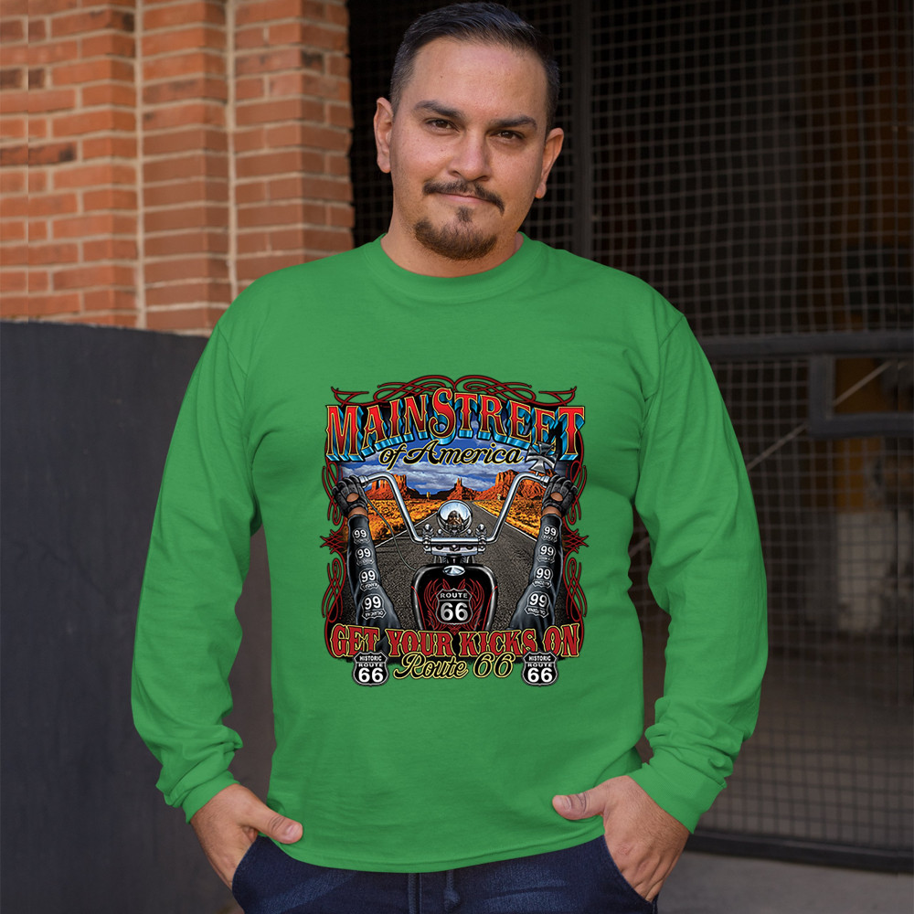 A print featuring a POV of a biker riding a chopper on a Route 66. There are are numerous "Route 66" and "Historic Route 66" signs all over the print and the print says: "Main street of America" and "Gwt your kicks on Route 66". A great choice for a motor