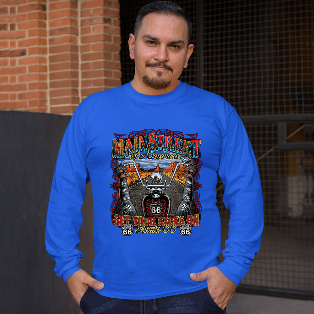 MAIN STREET OF AMERICA long sleeve t-shirt get your kicks on route 66 biker royal blue