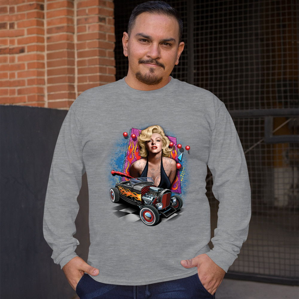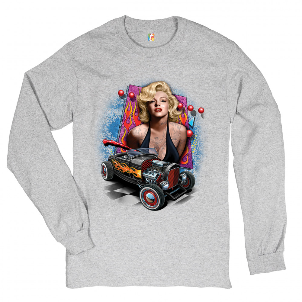 MARILYN MONROE HOT ROD long sleeve t-shirt vintage route 66 drag racing gray