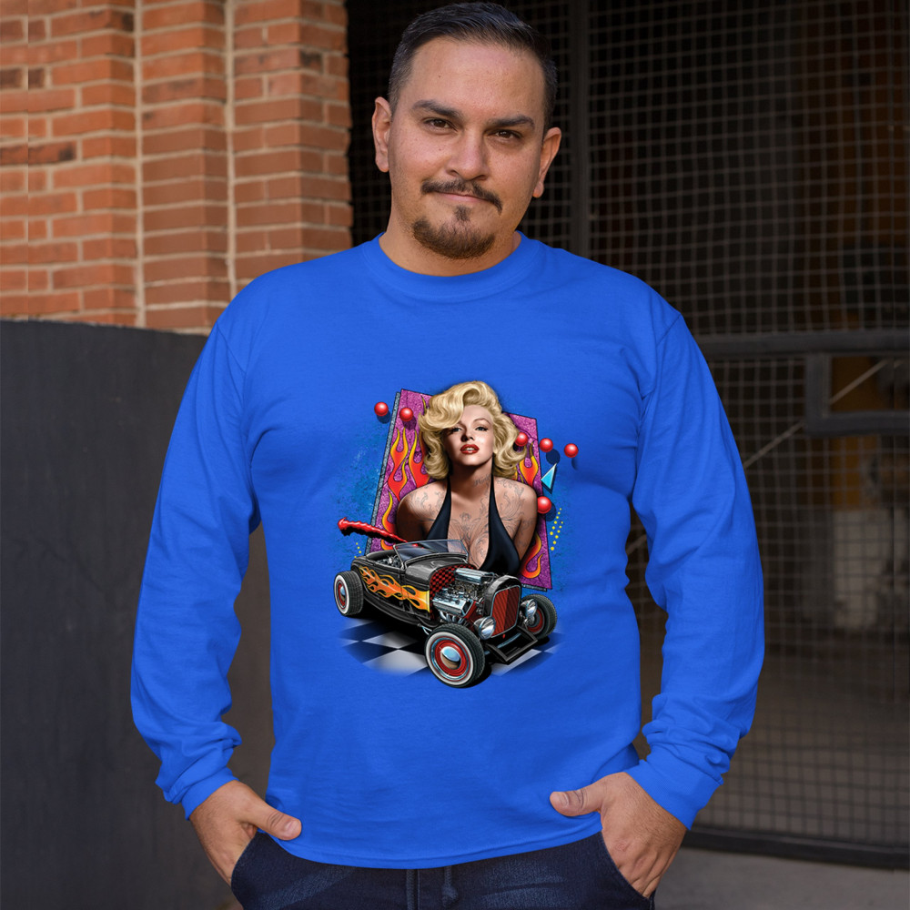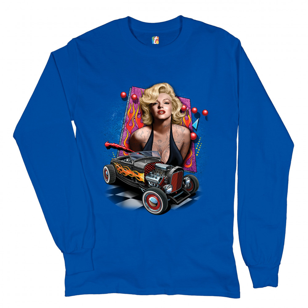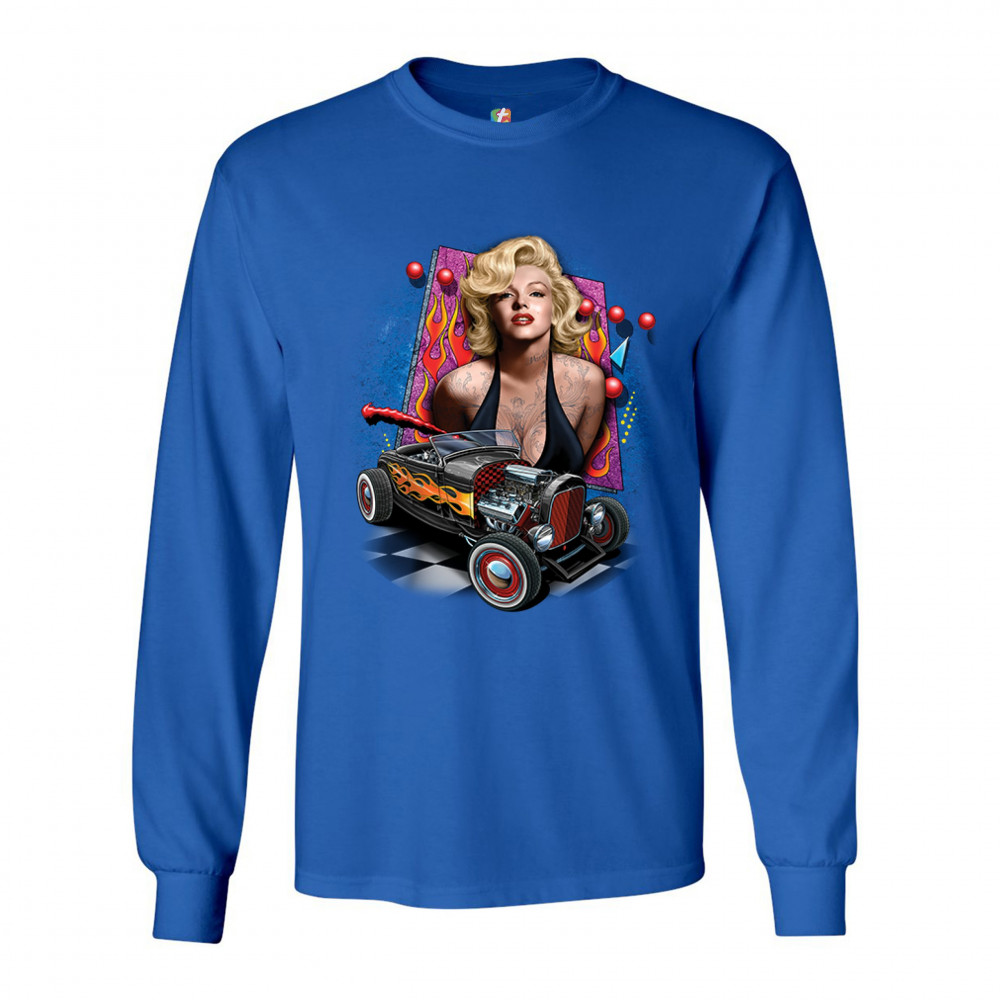 MARILYN MONROE HOT ROD long sleeve t-shirt vintage route 66 drag racing royal blue