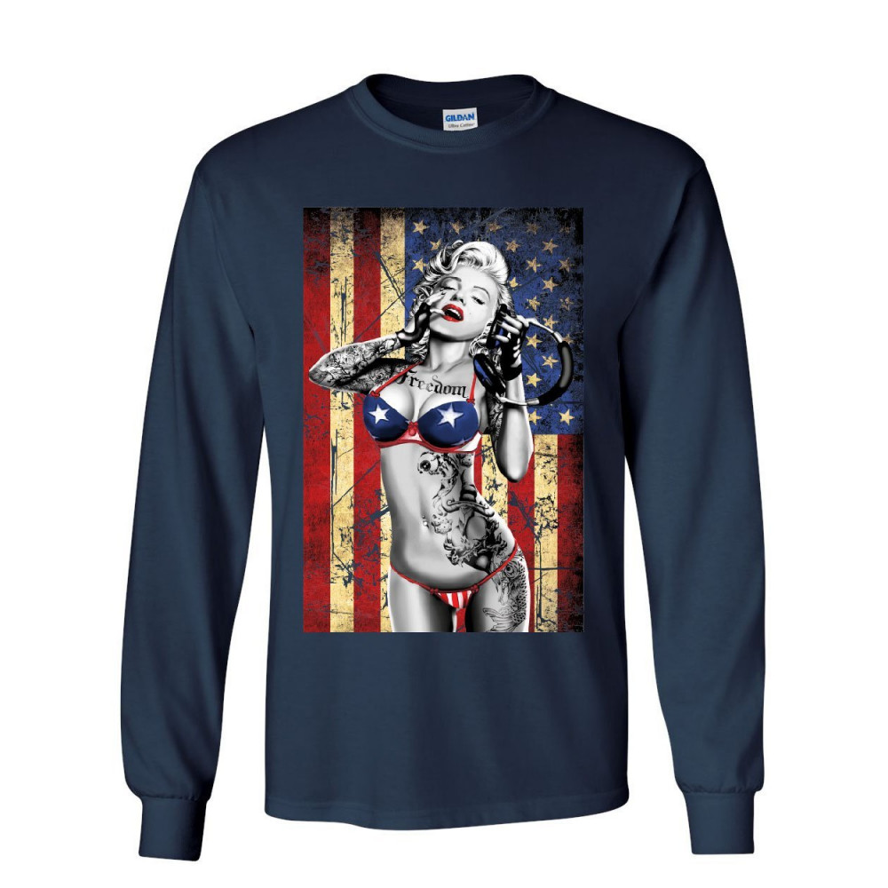 SEXY MARILYN MONROE US FLAG marilyn monroe us flag long sleeve t-shirt freedom sexy girl tattoos gangsta tee navy blue