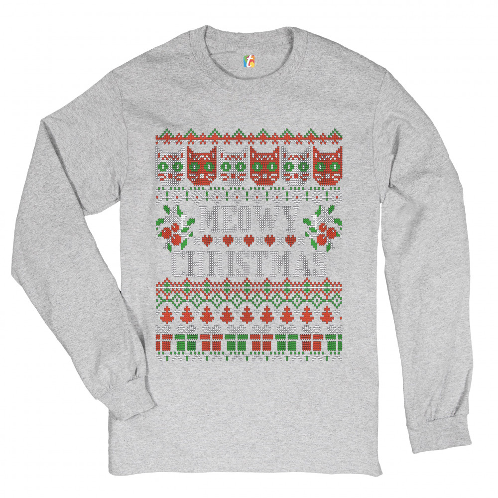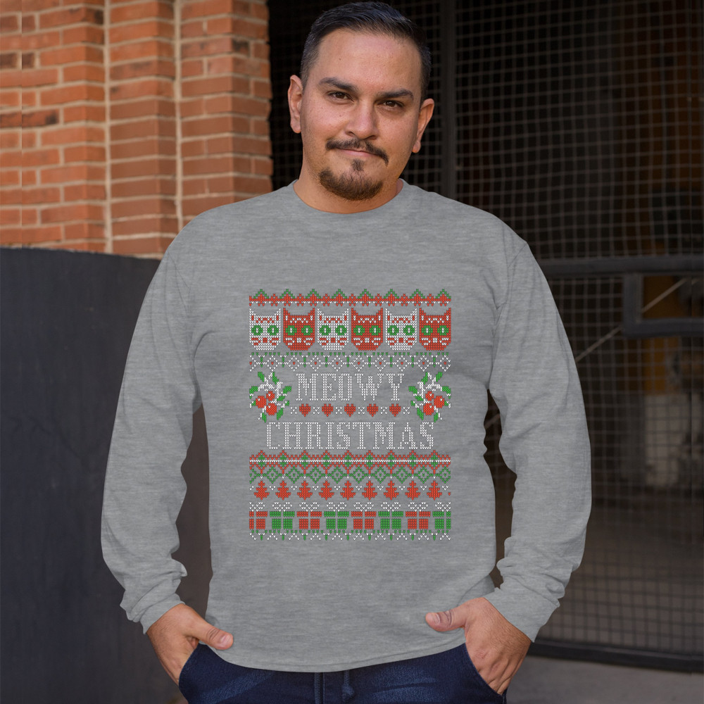 MEOWY CHRISTMAS long sleeve t-shirt ugly sweater cat lover funny xmas gray